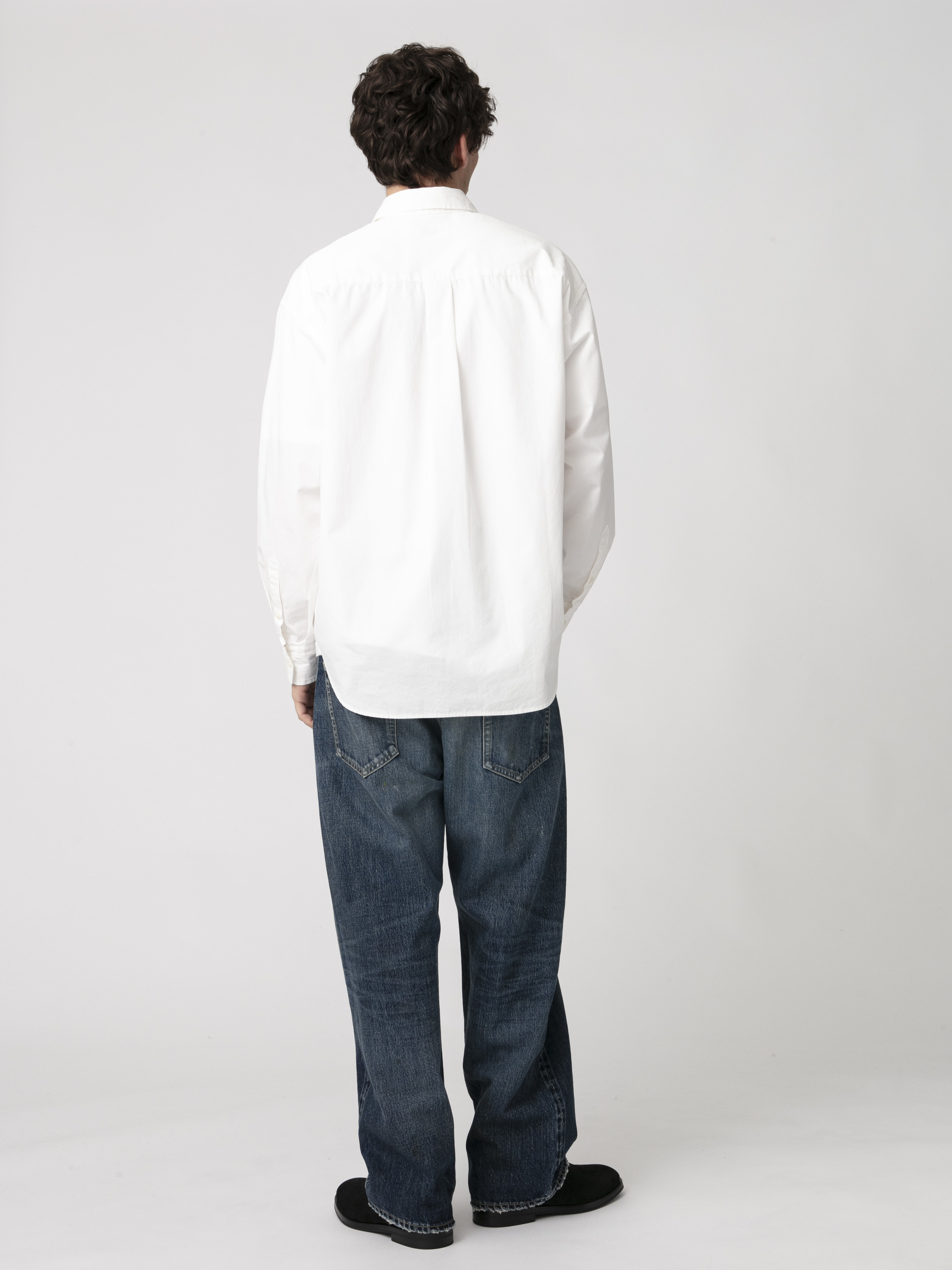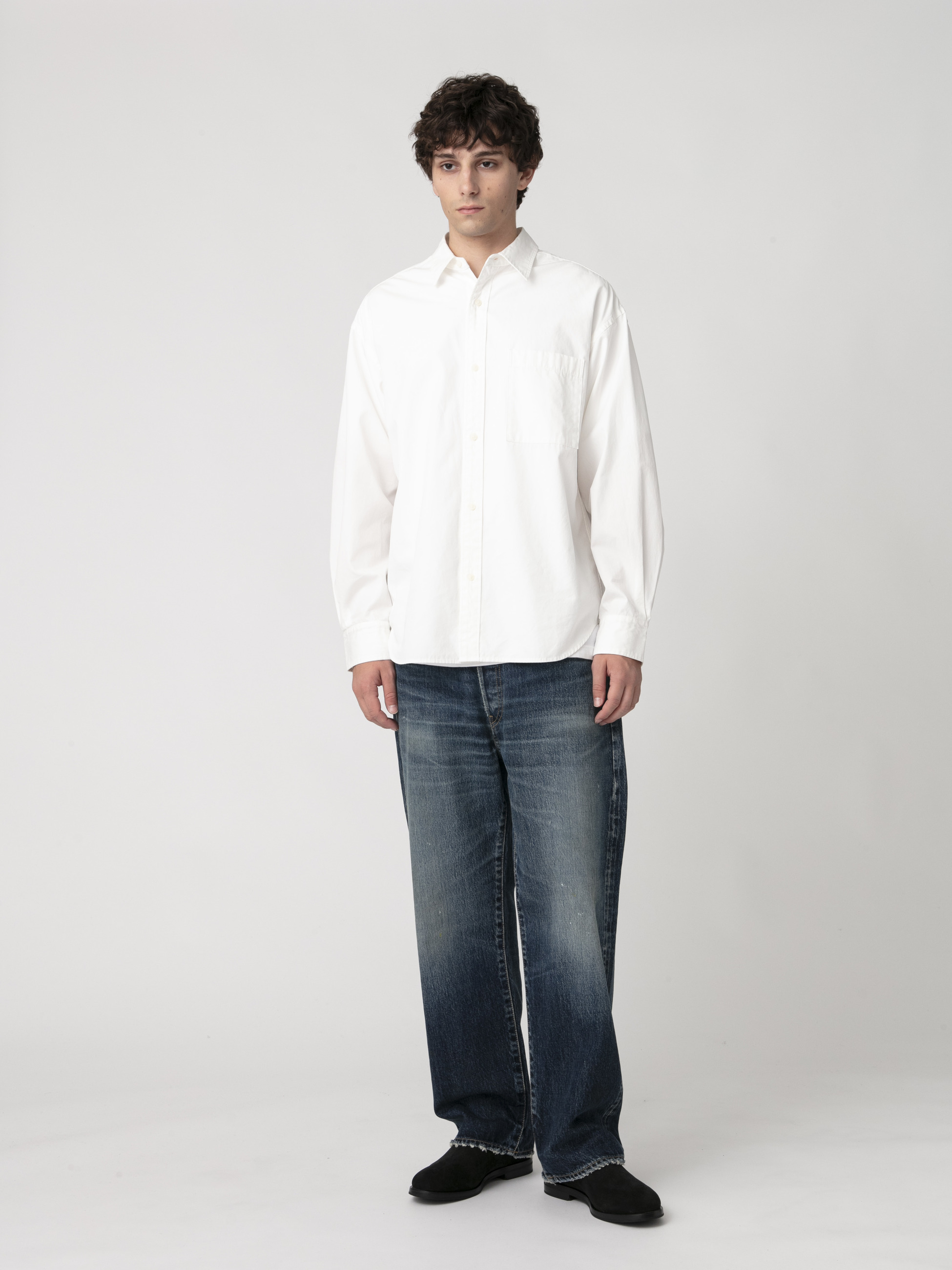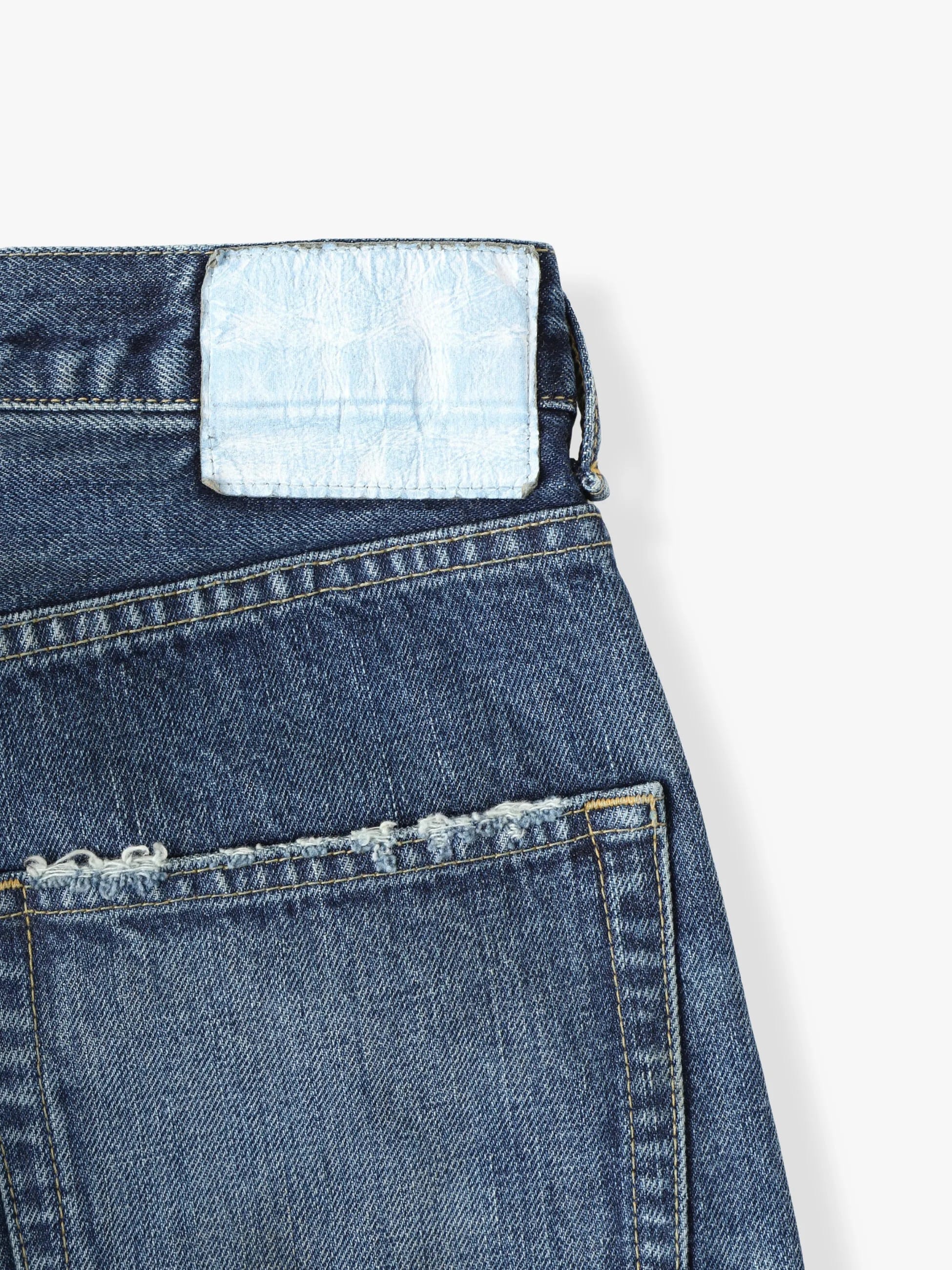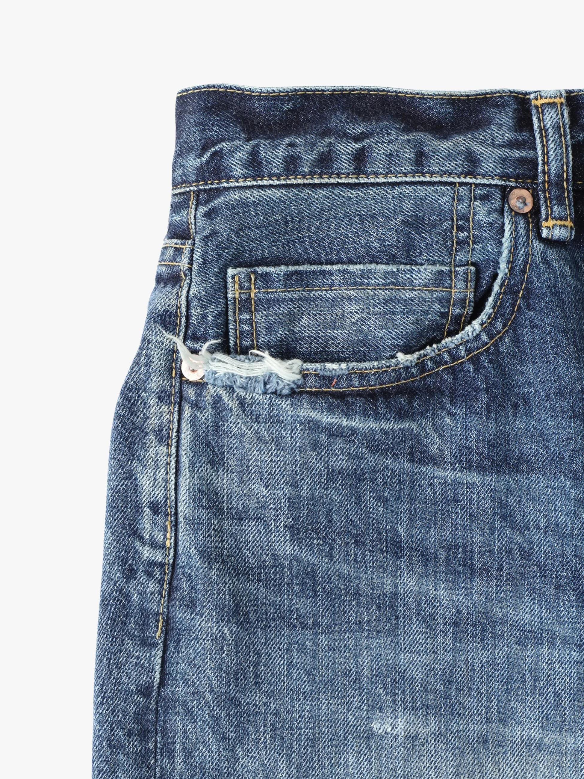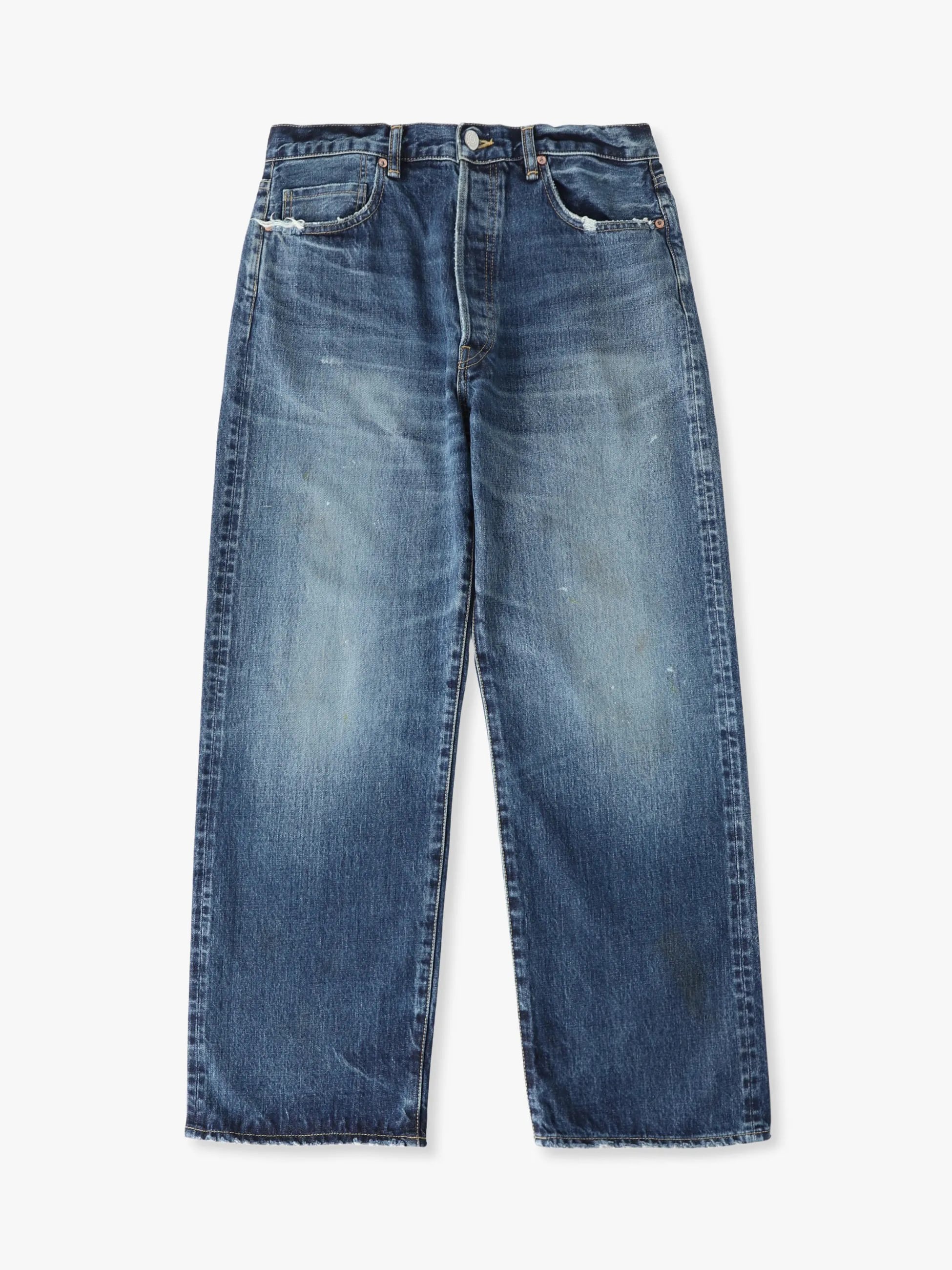 オリジナルで製作されたデニム生地を使用したワイドフィットデニムパンツ。クラシカルなディテールとポケット縁などに施したダメージ加工が特徴です。また、コスリやアタリ加工を施した、ヴィンテージのような風合いも魅力のひとつ。様々な時季で活躍する生地感とゆったりとした快適な穿き心地のワイドフィットは、シンプルなコーディネートに取り入れやすく、汎用性の高い一着です。