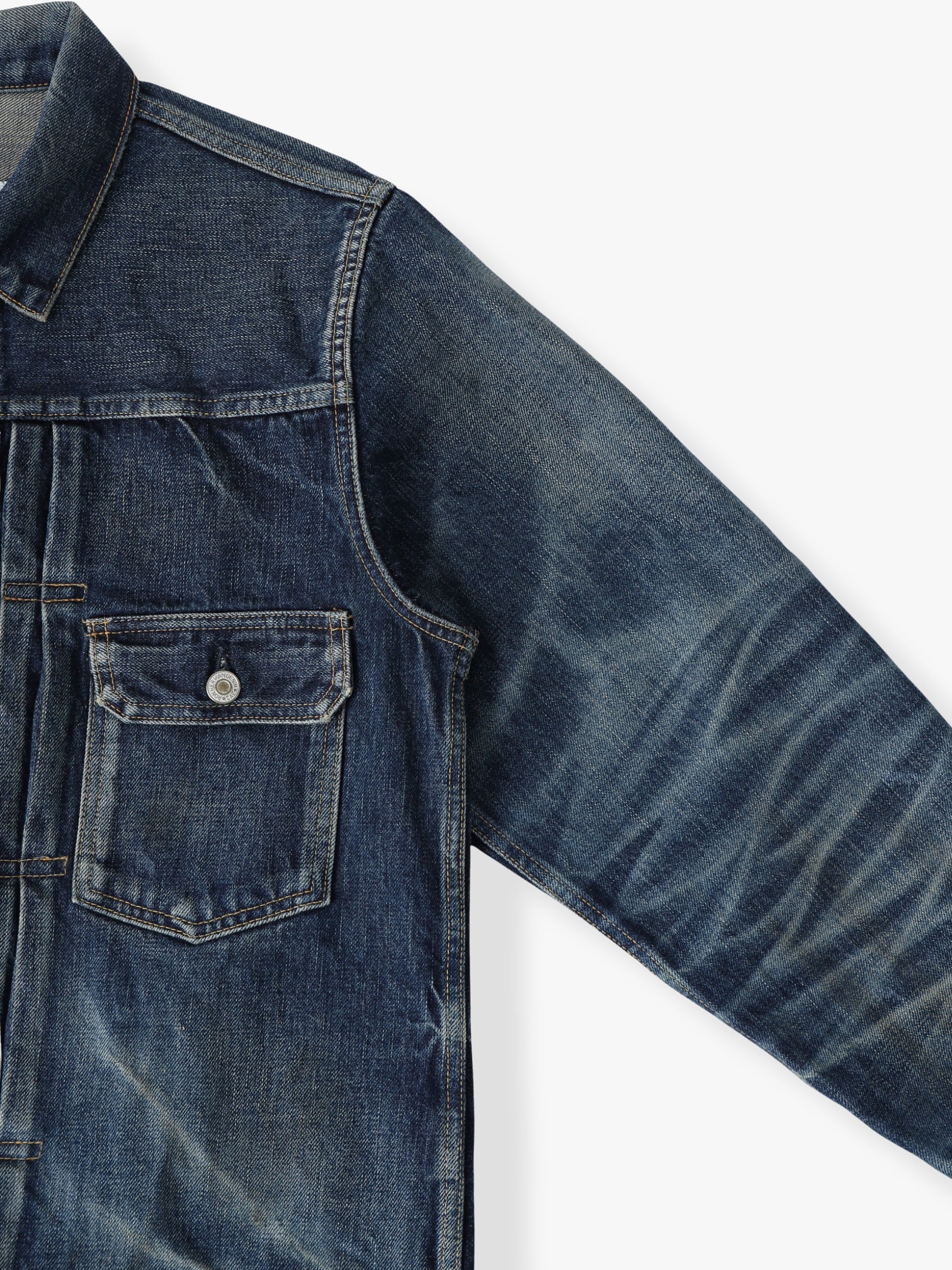 - 13オンスのデニムを使用した1stタイプモデルのデニムジャケットは、左右非対称のアタリ加工を強く表現することで、ヴィンテージのような表情を実現しています。また、クラシカルなディテールやコーディネートに合わせやすく仕上げた濃色のカラーリングもポイント。程よくゆったりとしたフィットは、デイリーユースしやすい一着です。