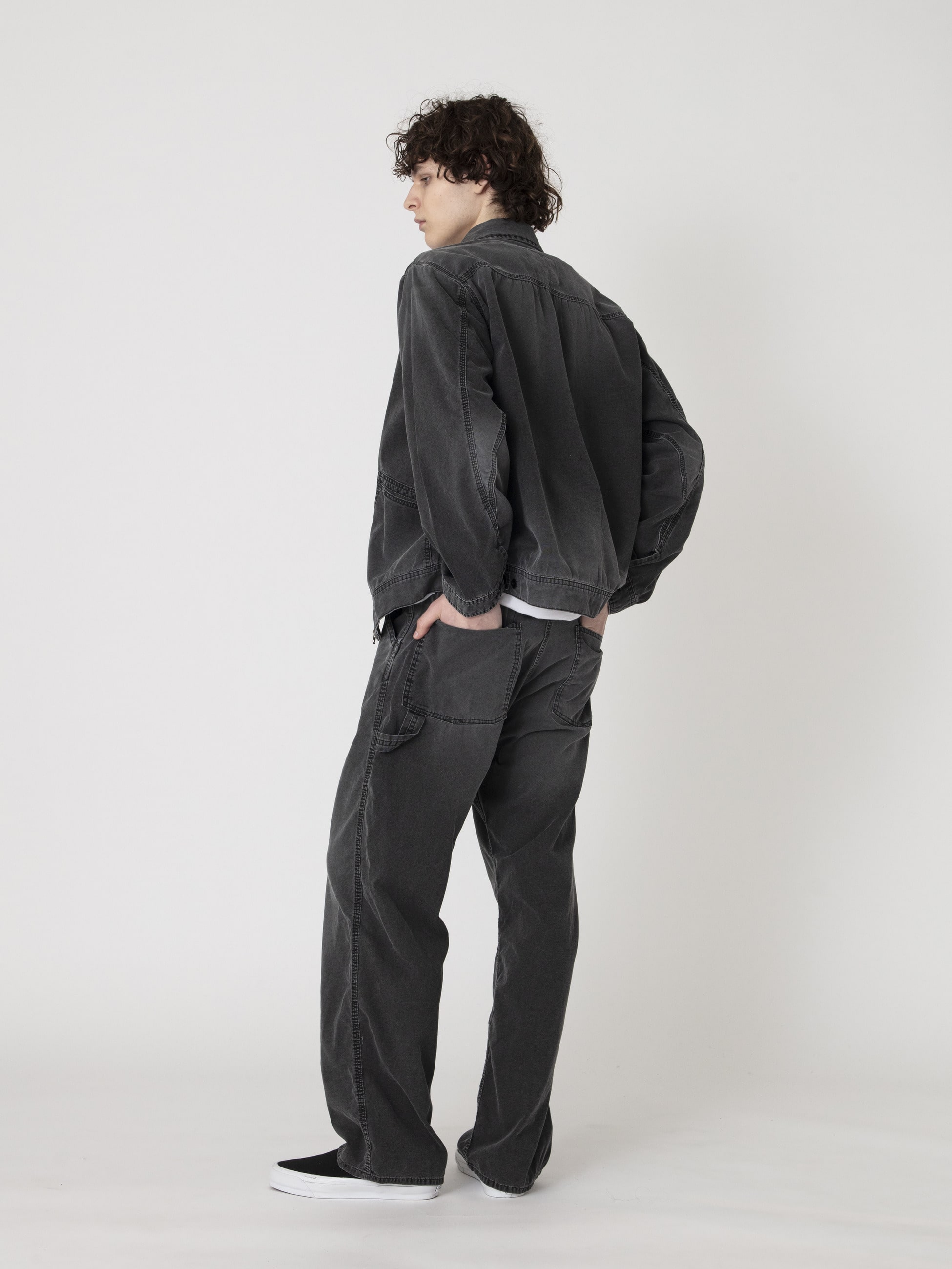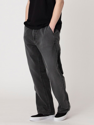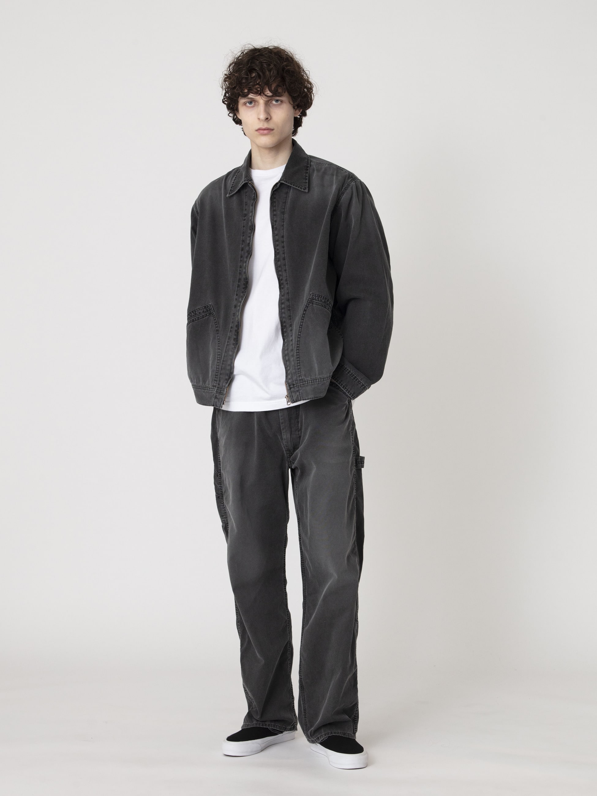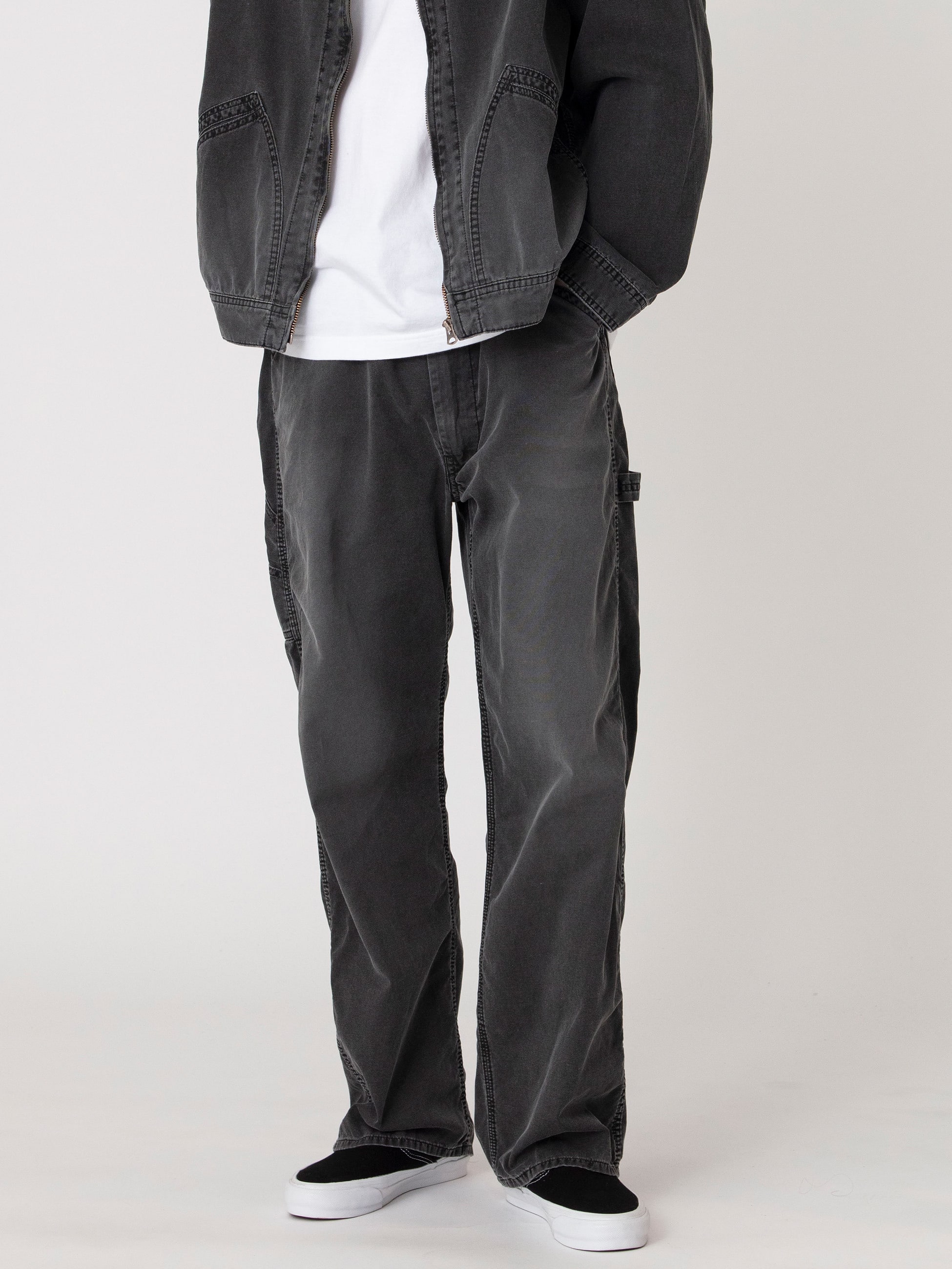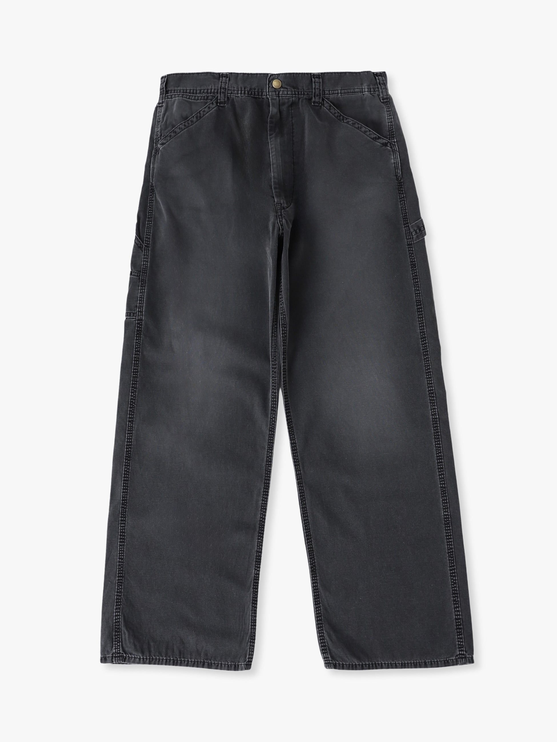 - ライトウェイトなダック生地を使用したペインターパンツは、ブラックカラーのピグメントダイ加工を施したフェードしたカラーリングが特徴です。また、ウォッシュ加工や適度にコスリ加工を施したヴィンテージのような表情もポイント。軽やかな着心地とゆったりとしたワイドフィットは、様々な時季で活躍する一着です。