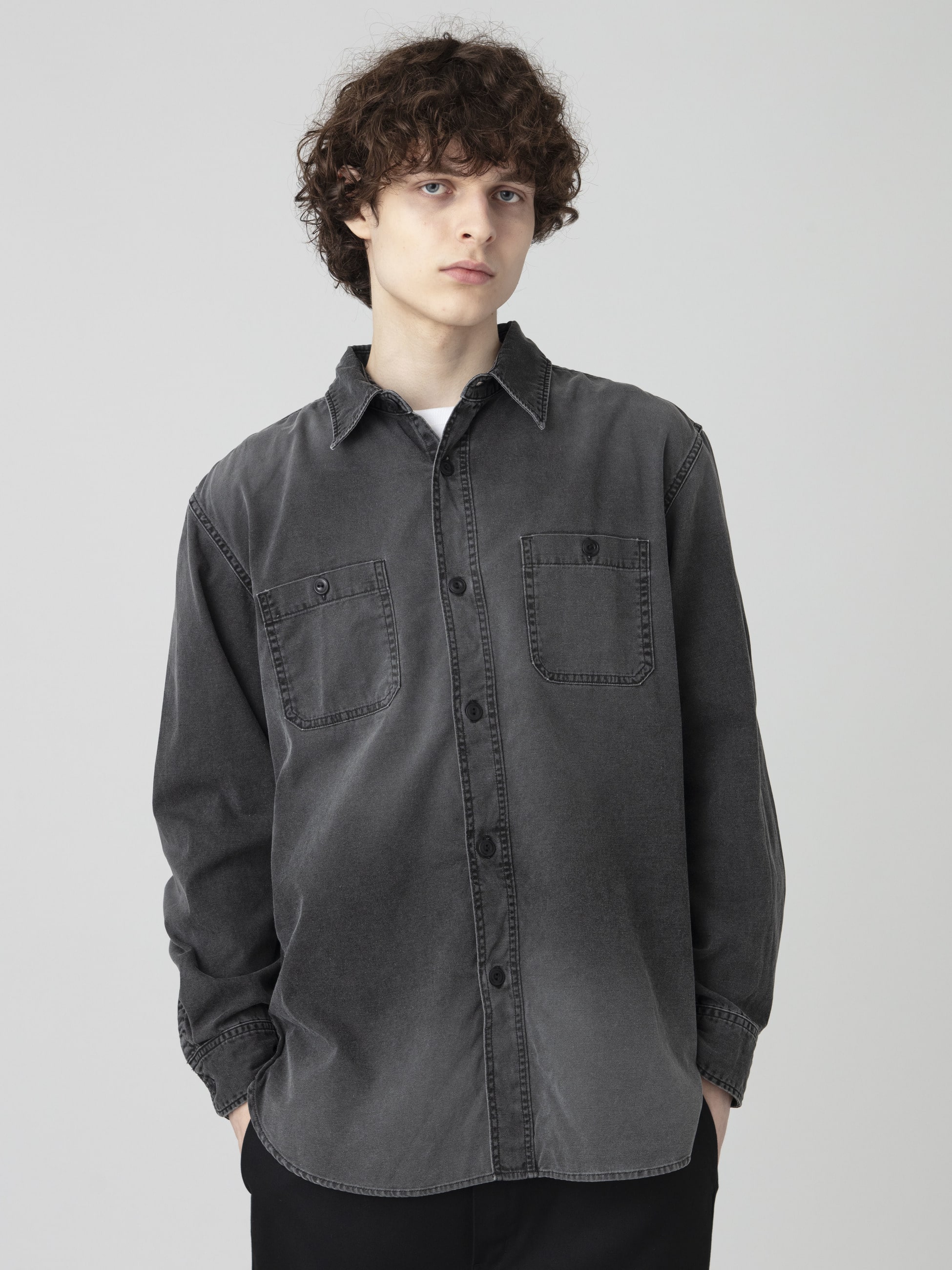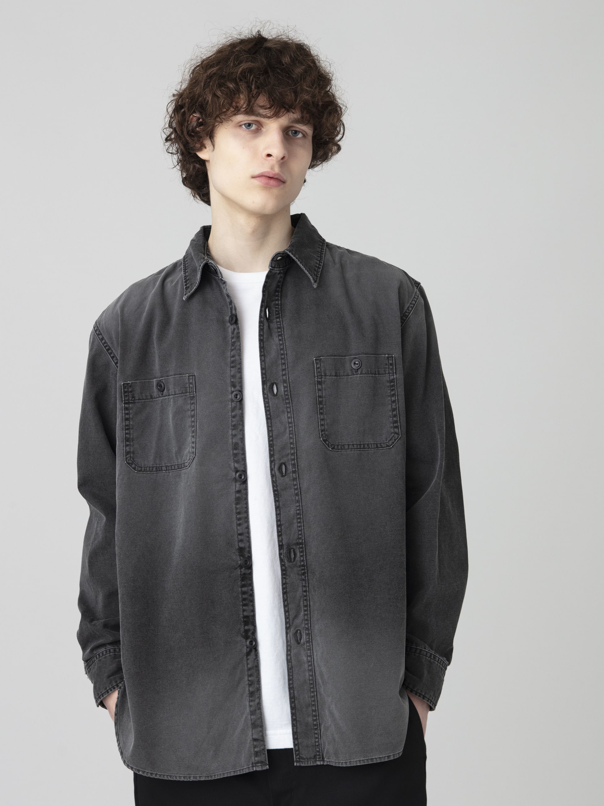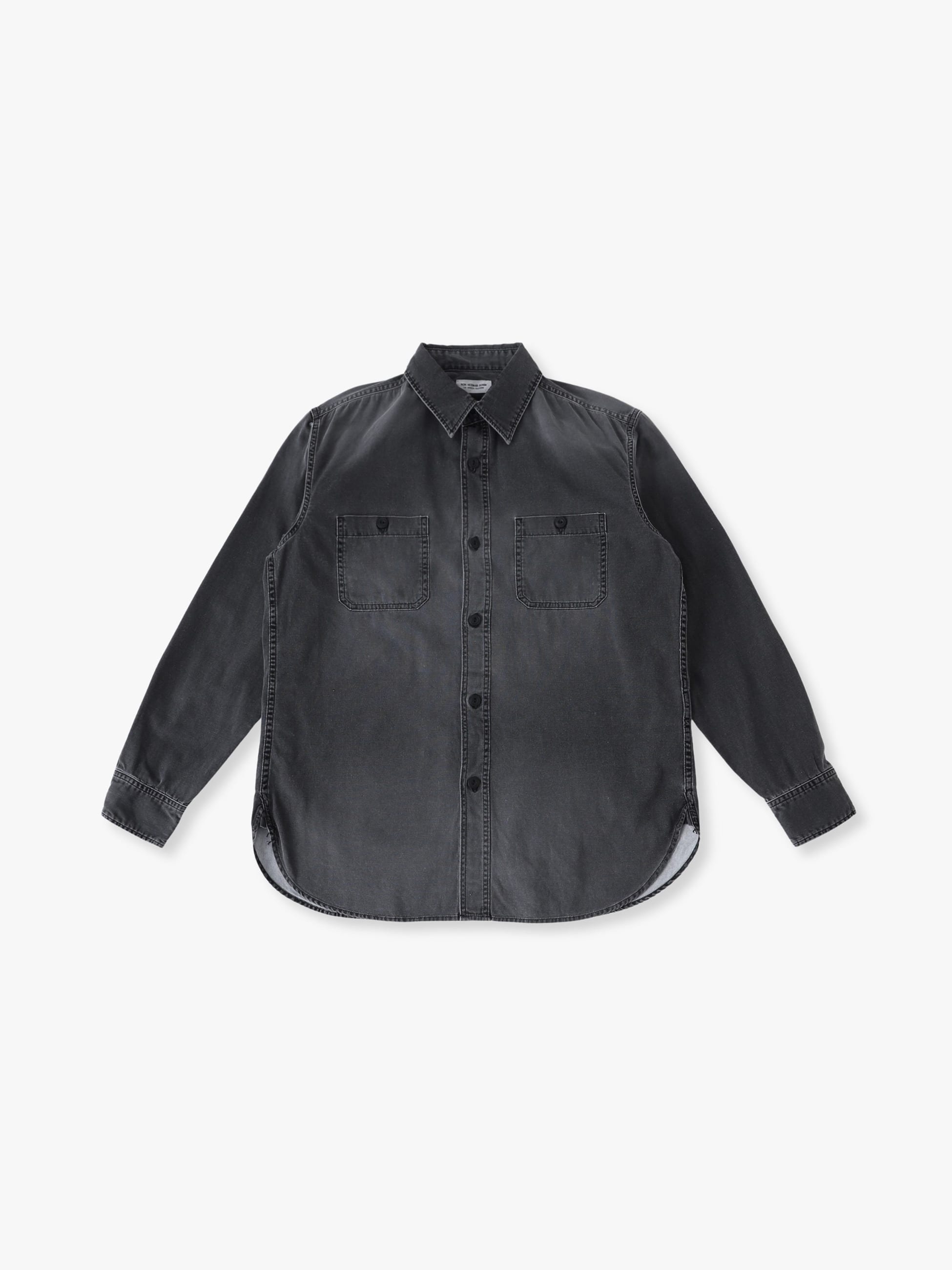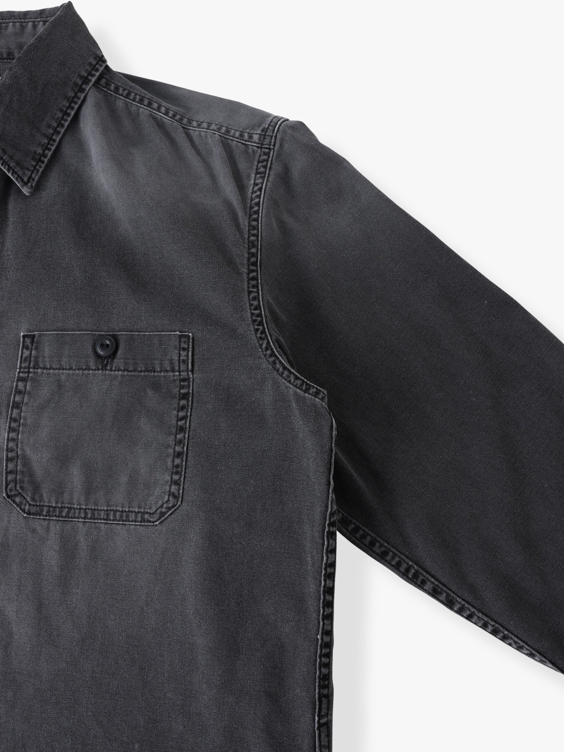 - ライトウェイトなダック生地を使用したシャツは、ブラックカラーのピグメントダイ加工を施したフェードしたカラーリングが特徴です。また、ウォッシュ加工や適度にコスリ加工を施したヴィンテージのような表情もポイント。軽やかな着心地と程よくゆったりとしたフィットは、様々な時季で活躍する一着です。