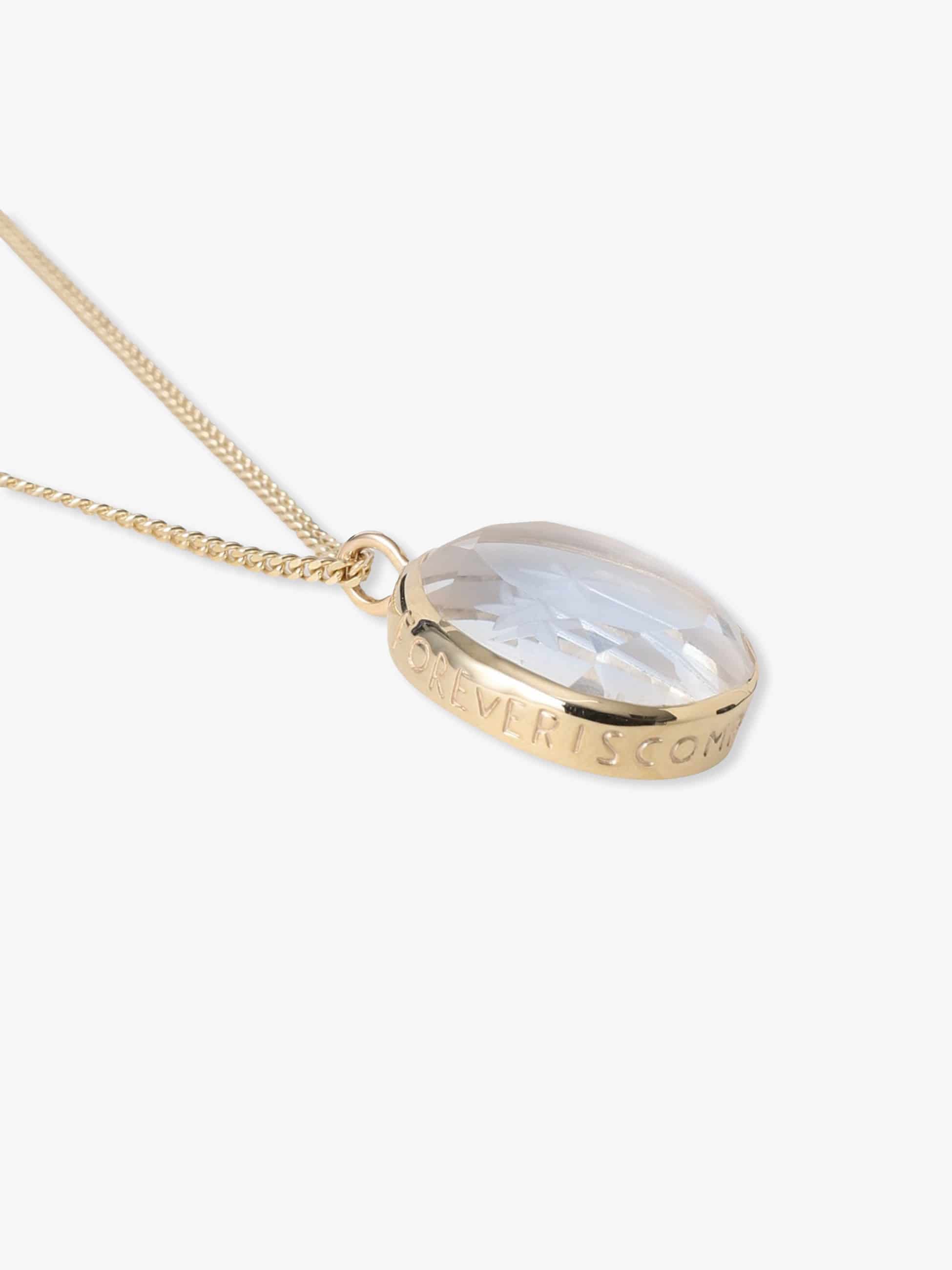 クリスタルのメダリオンに、ハンドエングレービングによってパームツリーと星空があしらわれたネックレスは、縁にはアメリカの詩人エミリー・ディキンソンの言葉 “Forever is composed of nows(永遠は“いま”の積み重ね)”のメッセージを刻印し、デザイン性を高めています。立体的なカット施されたクリスタルが光を受け、彫刻と文字が美しく響き合います。