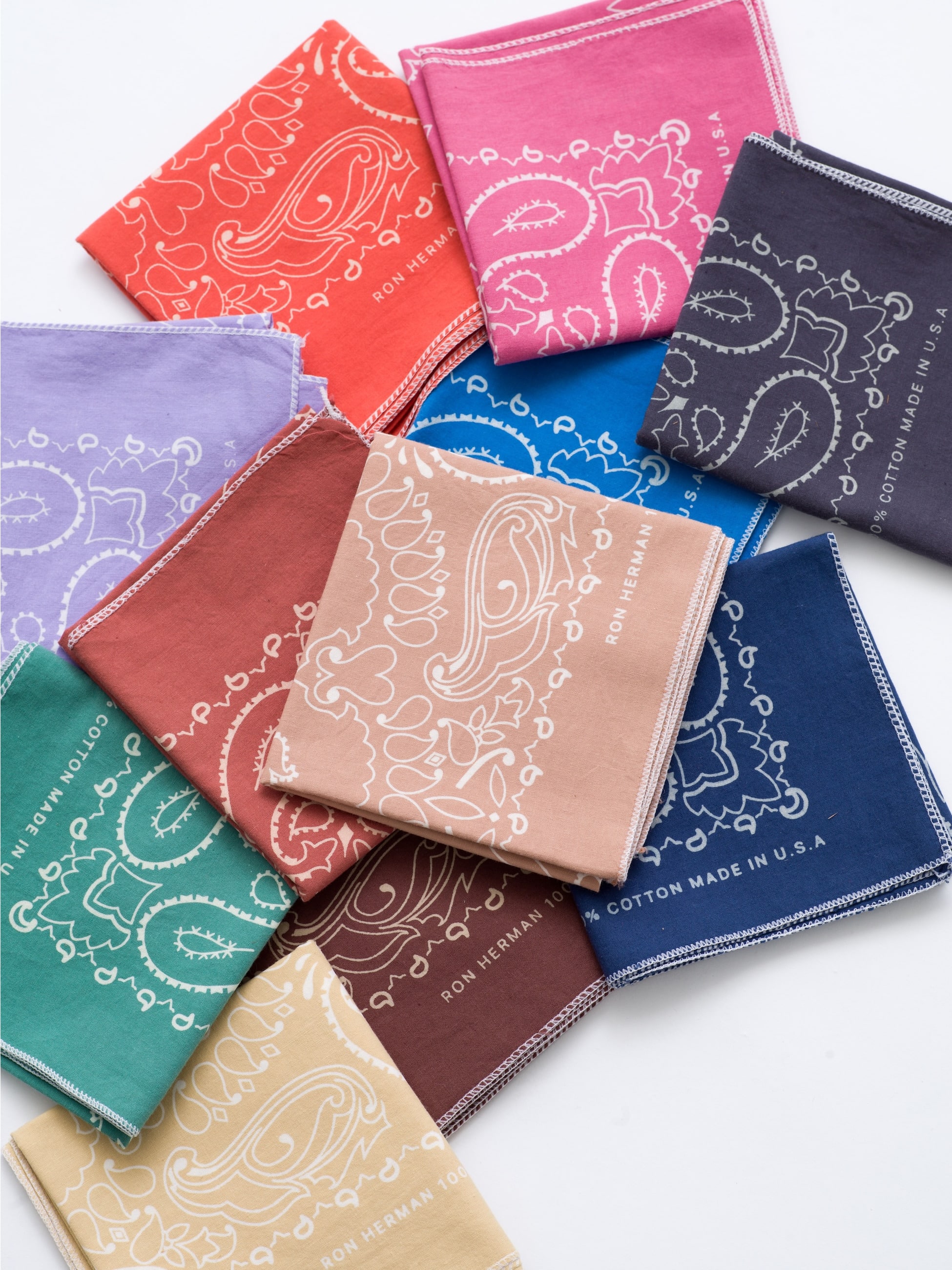 - 「HAV-A-HANK」から、ロンハーマンのためだけにつくられたバンダナが12色展開で登場。「HAV-A-HANK」の最もクラシックなパターンのバンダナ柄をベースに、カラーリングを組み換え、オリジナルカラーに仕上げています。また、サイドに施されたロゴは筆記体の特別仕様も魅力のひとつ。気分やコーディネートによって色合わせを楽しみたくなるデイリーアイテムです。