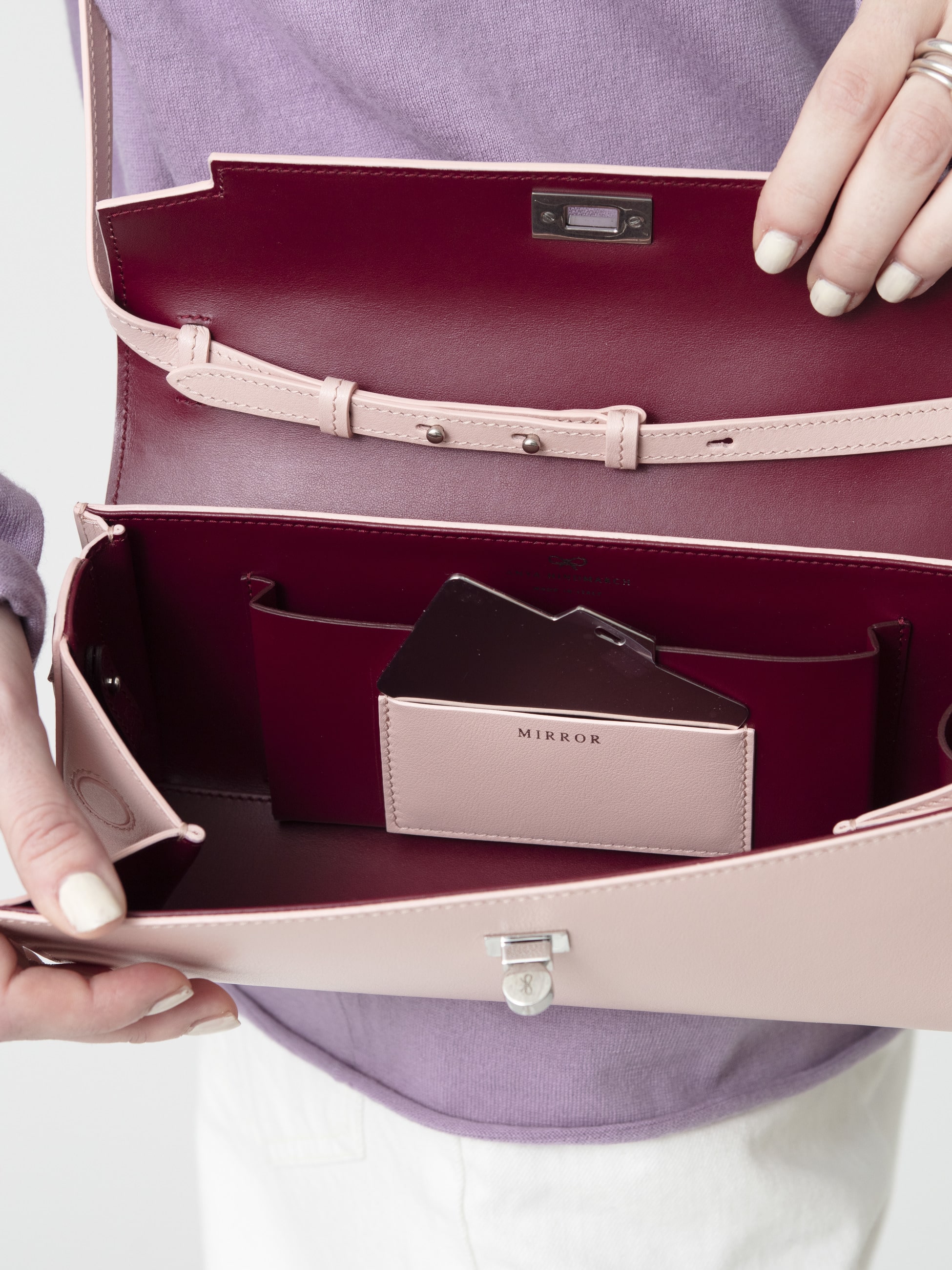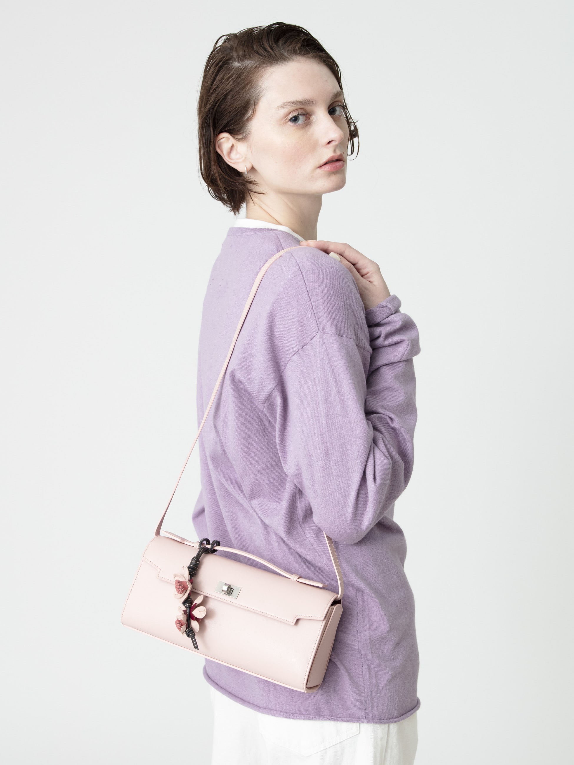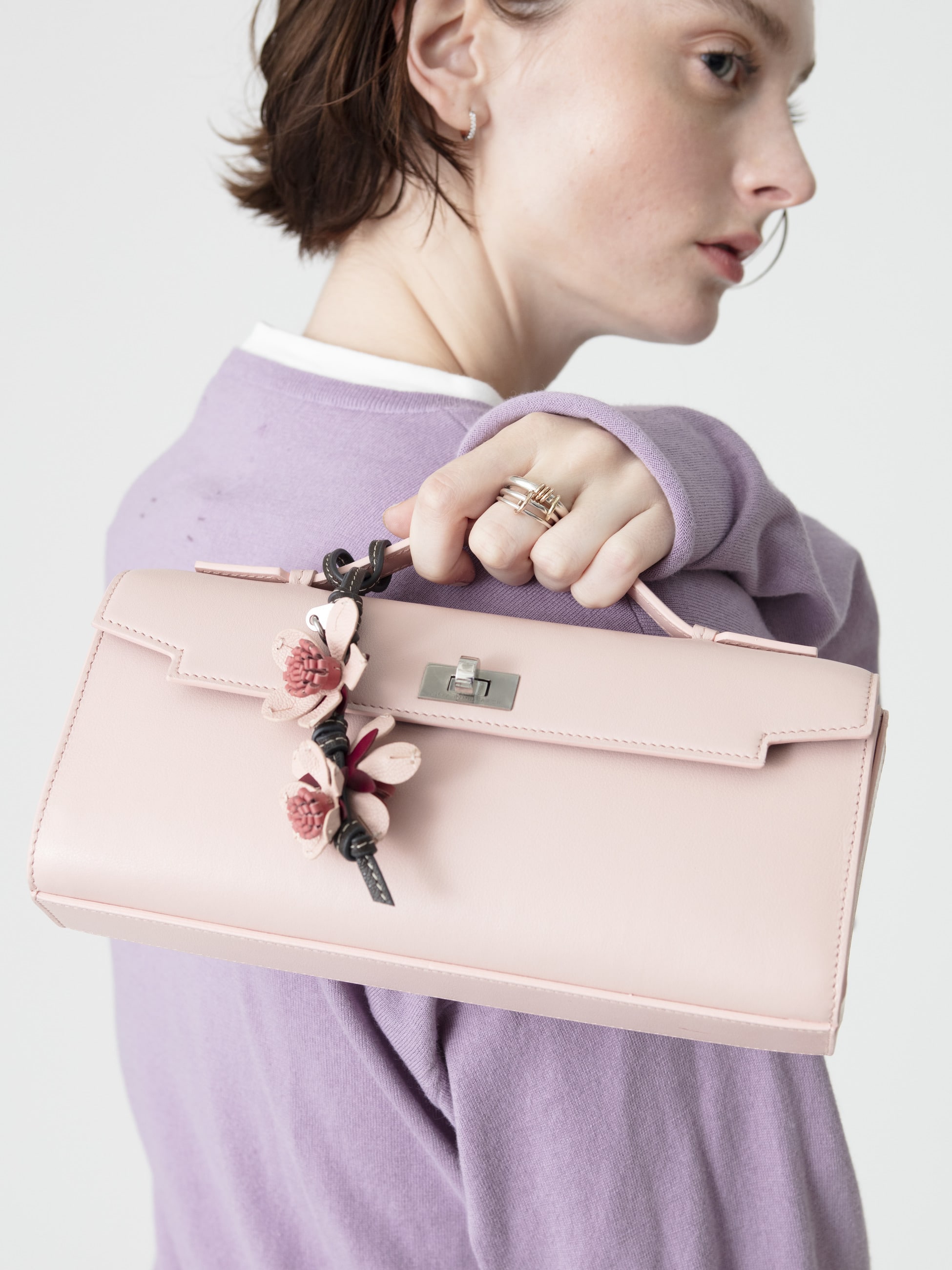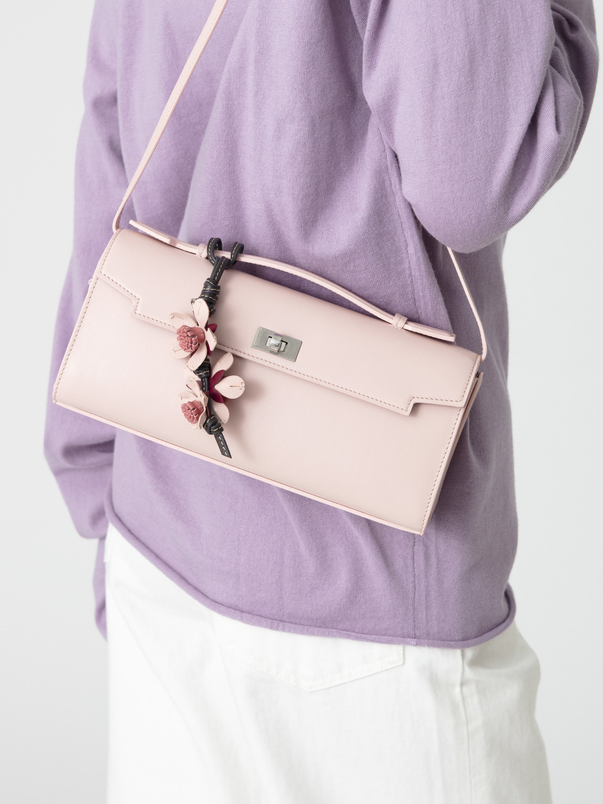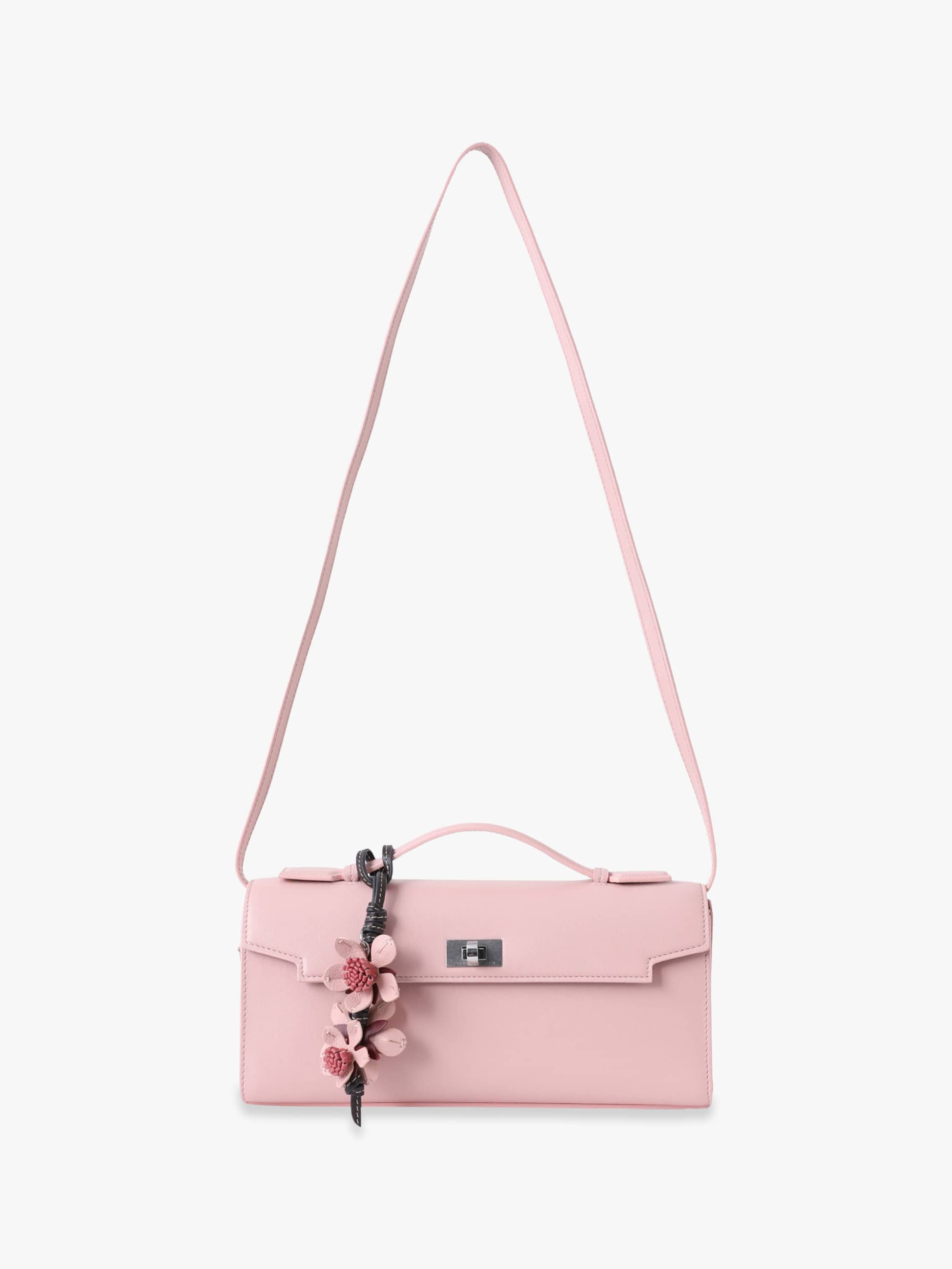 ピンクの美しい色合いに、桜モチーフのチャームを添えた可憐なデザインが華やかな“Sakura”シリーズが、オンラインストア限定で登場です。モティマーシリーズの新作「Mortimer Clutch」は、外側は上品なピンク、内側はボルドーのバイカラーで、開けるたびに心ときめく配色。スマートなサイズ感ながらも、スマートフォンが収まるポケットやリップスティック用のコンパートメント、さらに「Mirror」と刻印された鏡用ポケットには、シルバートーンに輝くミラーも備えられています。トップハンドルでクラッチとして、また付属のストラップで肩から掛けてと、2WAYでお使いいただけます。