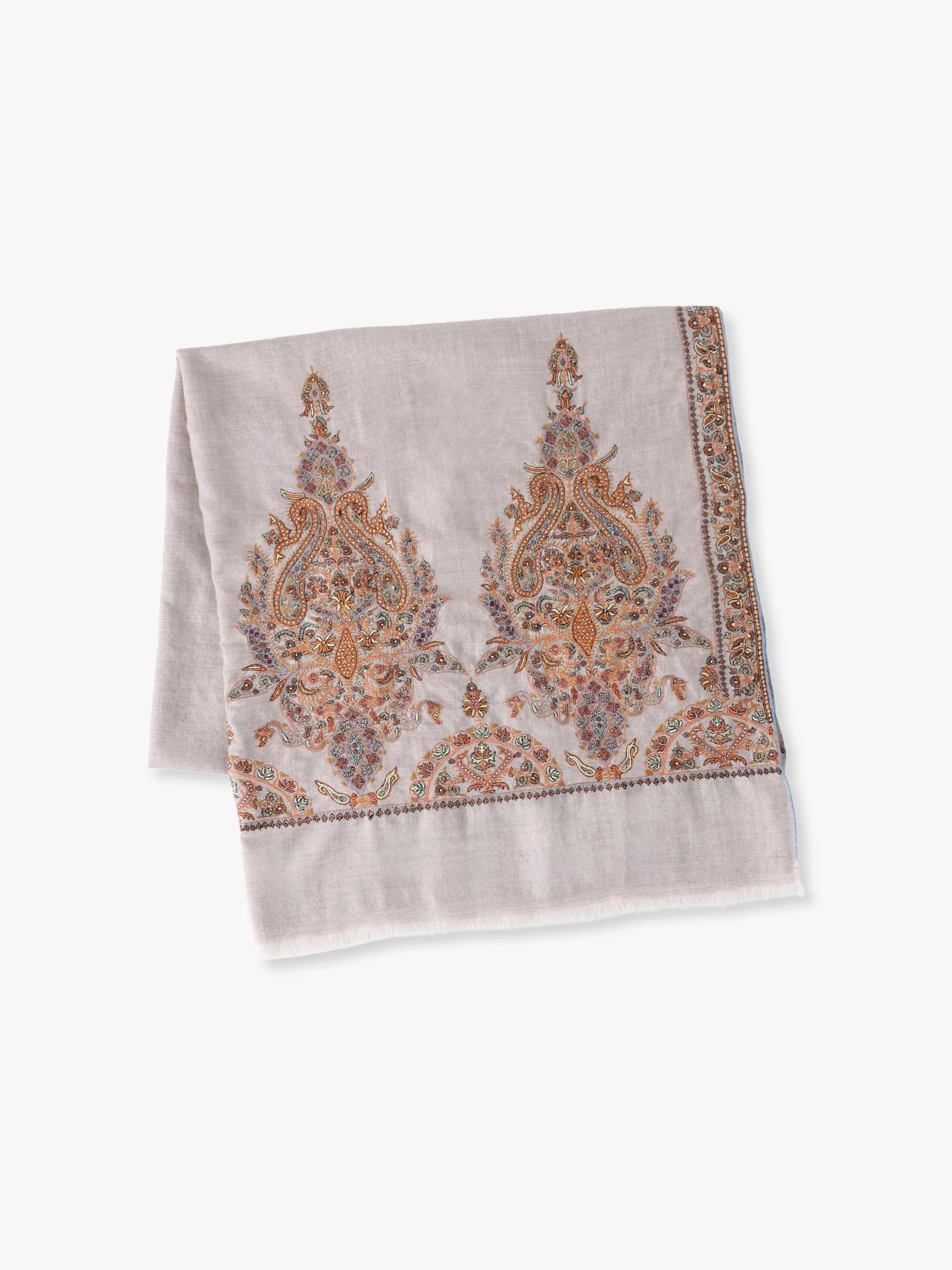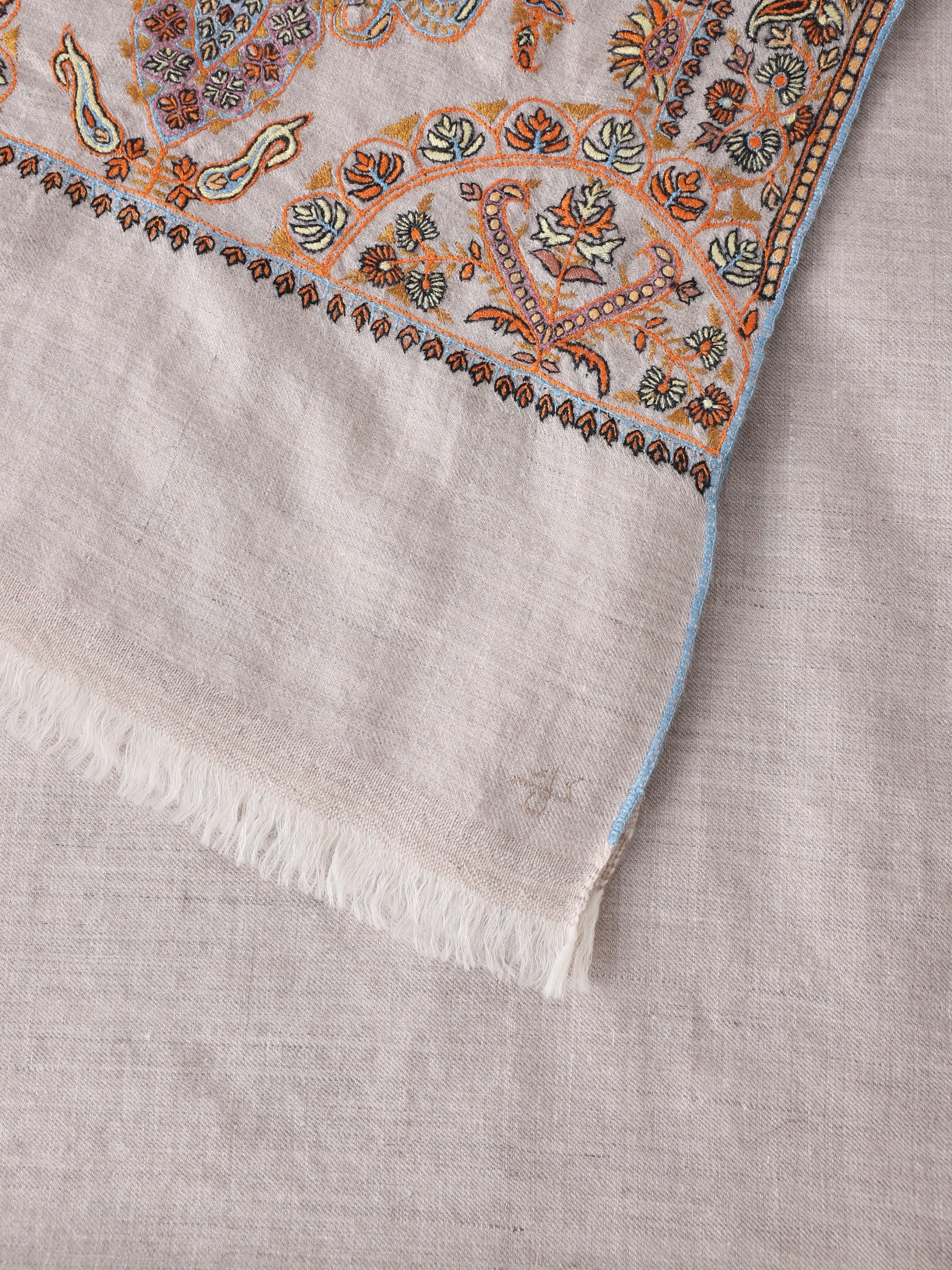 インドのカシミール地方で、一点一点手仕事による見事な刺繍が施された宝石のようなストール。見ているだけで美しく、職人さんの息遣いや色のバランス、モダンに昇華された柄は長くご愛用いただけます。デニムとTシャツなどのシンプルなコーディネートにさらりと巻いたり、ドレスの上から羽織ったりとさまざまなスタイリングと好相性です。自分だけでなく、周りの人の心も目も楽しませてくれるスペシャルな一枚を是非お楽しみください。職人さんのイニシャルが刺繍でしてあるところもポイントです。