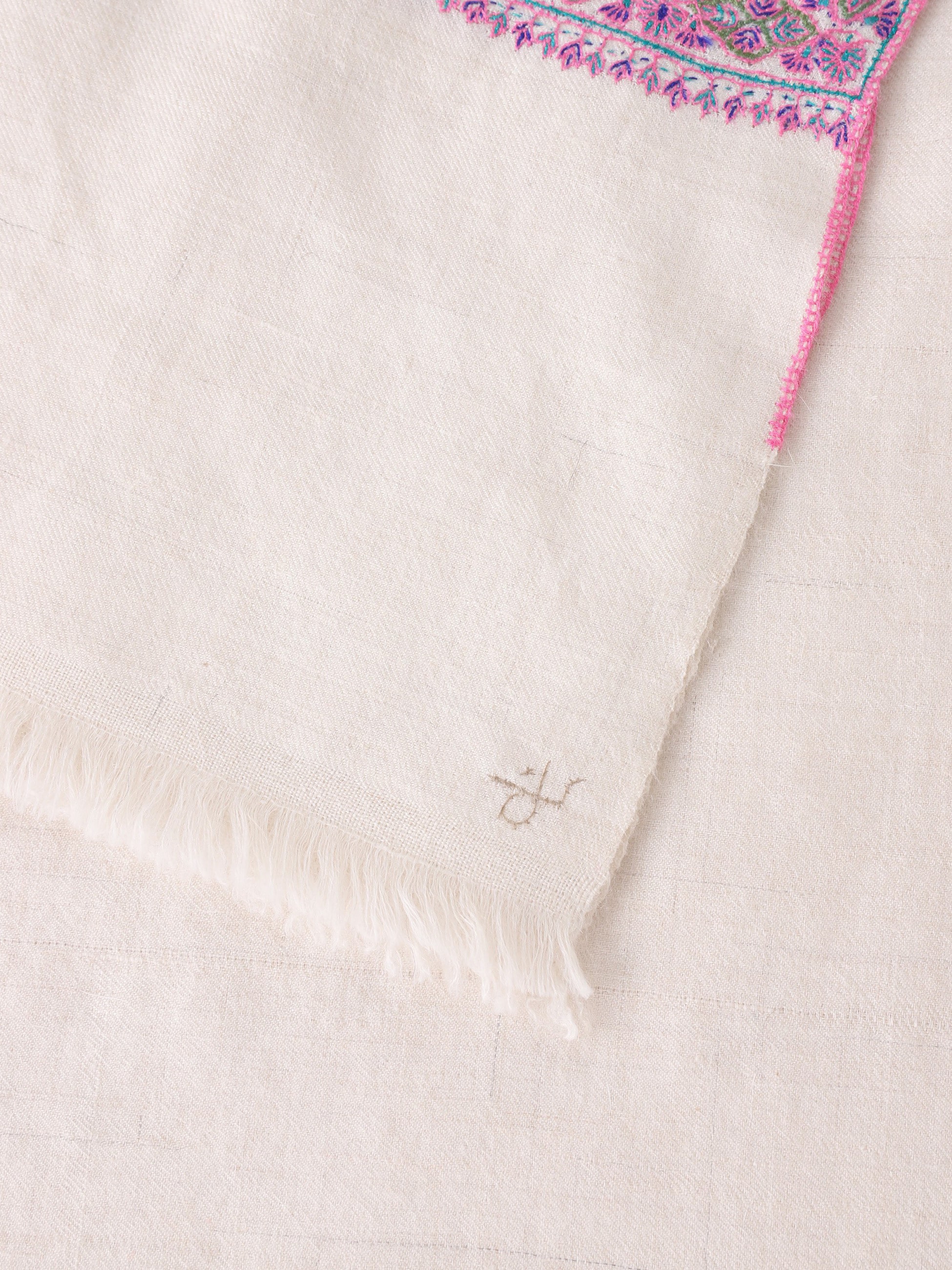 インドのカシミール地方で、一点一点手仕事による見事な刺繍が施された宝石のようなストール。見ているだけで美しく、職人さんの息遣いや色のバランス、モダンに昇華された柄は長くご愛用いただけます。デニムとTシャツなどのシンプルなコーディネートにさらりと巻いたり、ドレスの上から羽織ったりとさまざまなスタイリングと好相性です。自分だけでなく、周りの人の心も目も楽しませてくれるスペシャルな一枚を是非お楽しみください。職人さんのイニシャルが刺繍でしてあるところもポイントです。