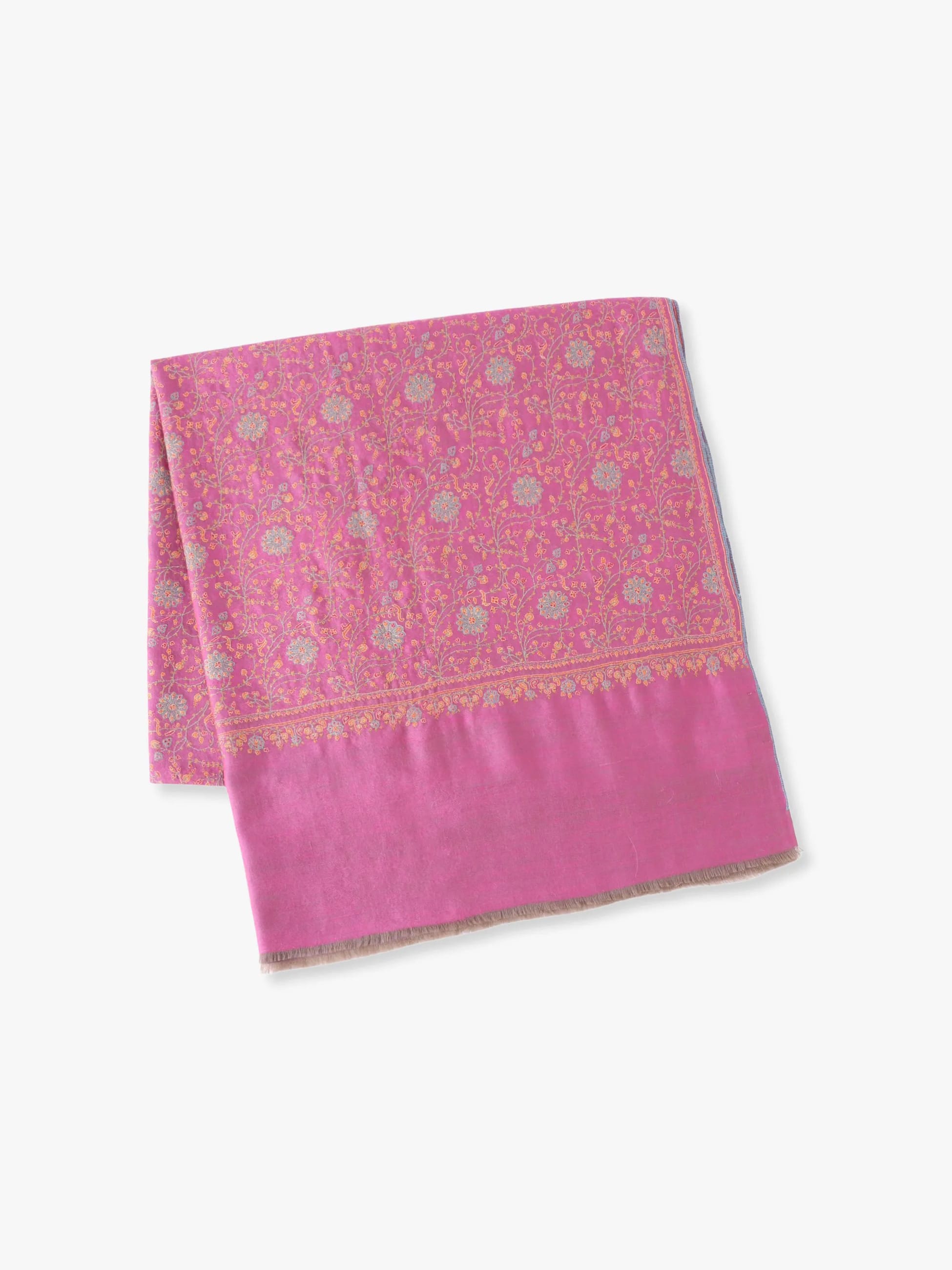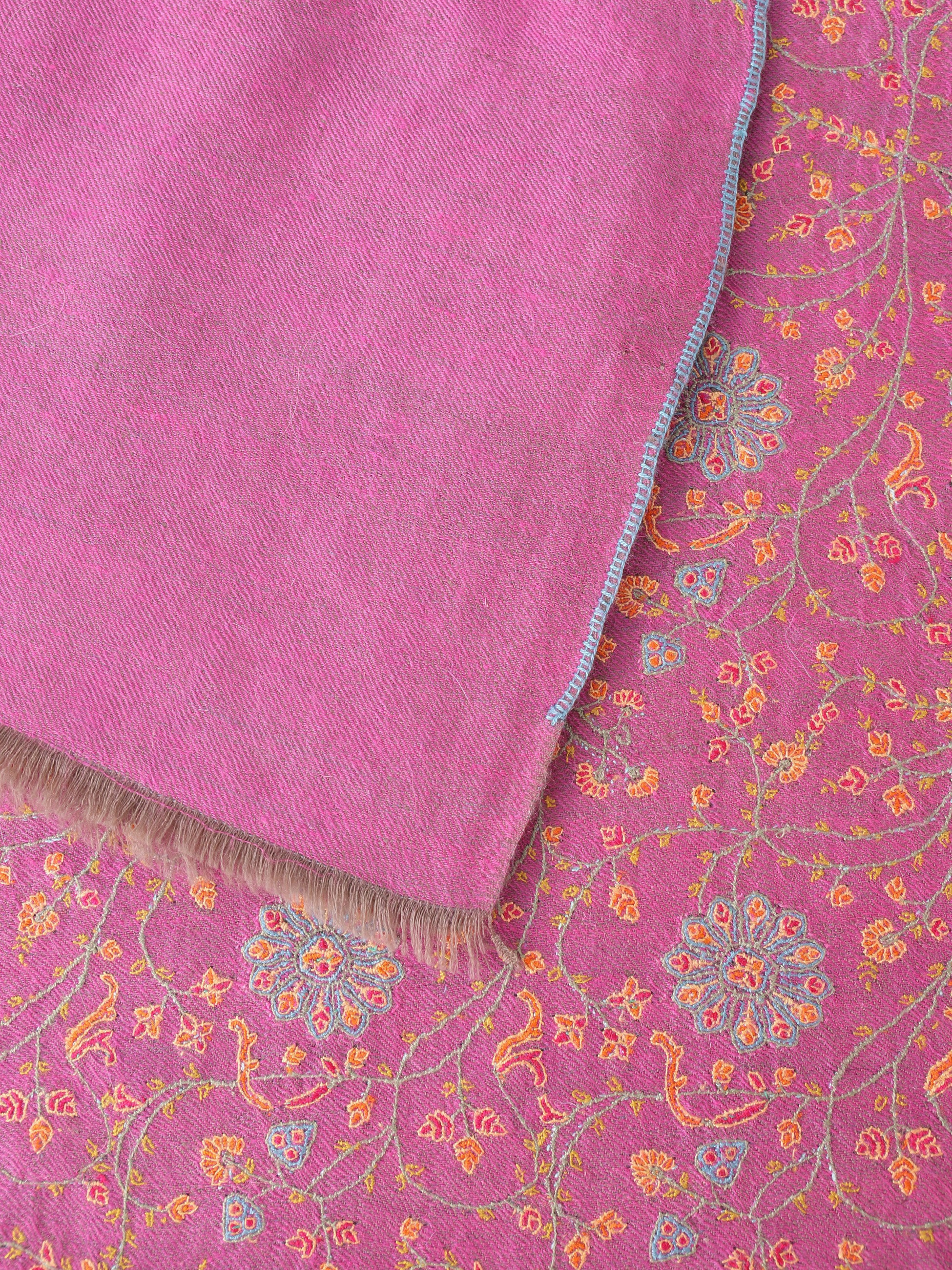 インドのカシミール地方で、一点一点手仕事による見事な刺繍が施された宝石のようなストール。見ているだけで美しく、職人さんの息遣いや色のバランス、モダンに昇華された柄は長くご愛用いただけます。デニムとTシャツなどのシンプルなコーディネートにさらりと巻いたり、ドレスの上から羽織ったりとさまざまなスタイリングと好相性です。自分だけでなく、周りの人の心も目も楽しませてくれるスペシャルな一枚を是非お楽しみください。職人さんのイニシャルが刺繍でしてあるところもポイントです。