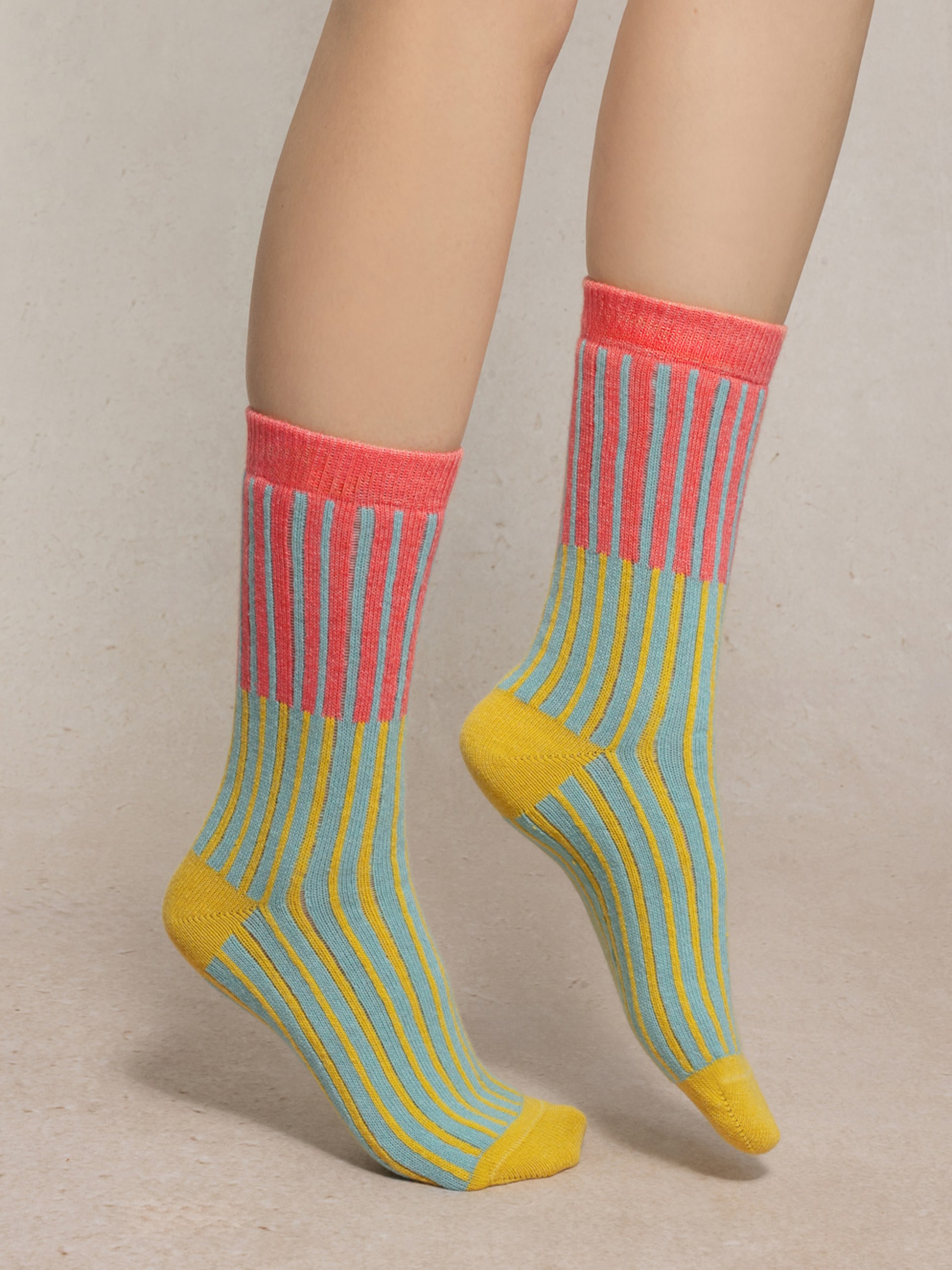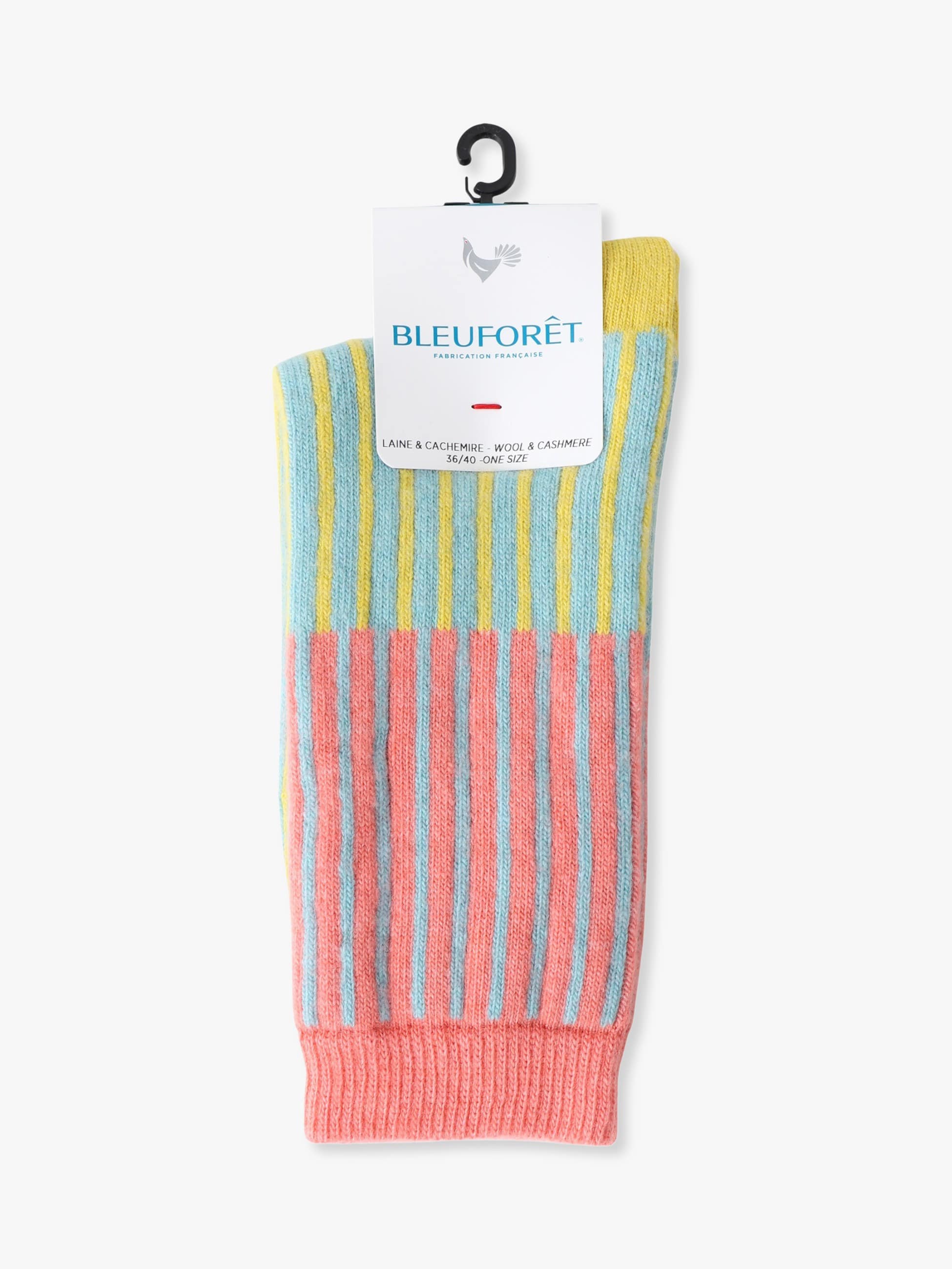 マルチストライプが可愛らしい、カラフルソックスです。コーディネートのワンポイントとして活躍し、秋冬の重くなりがちなスタイリングに、華やなさをプラスします。その他のBLEU FORETのアイテムもございます。