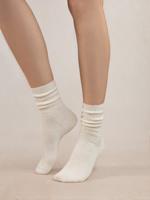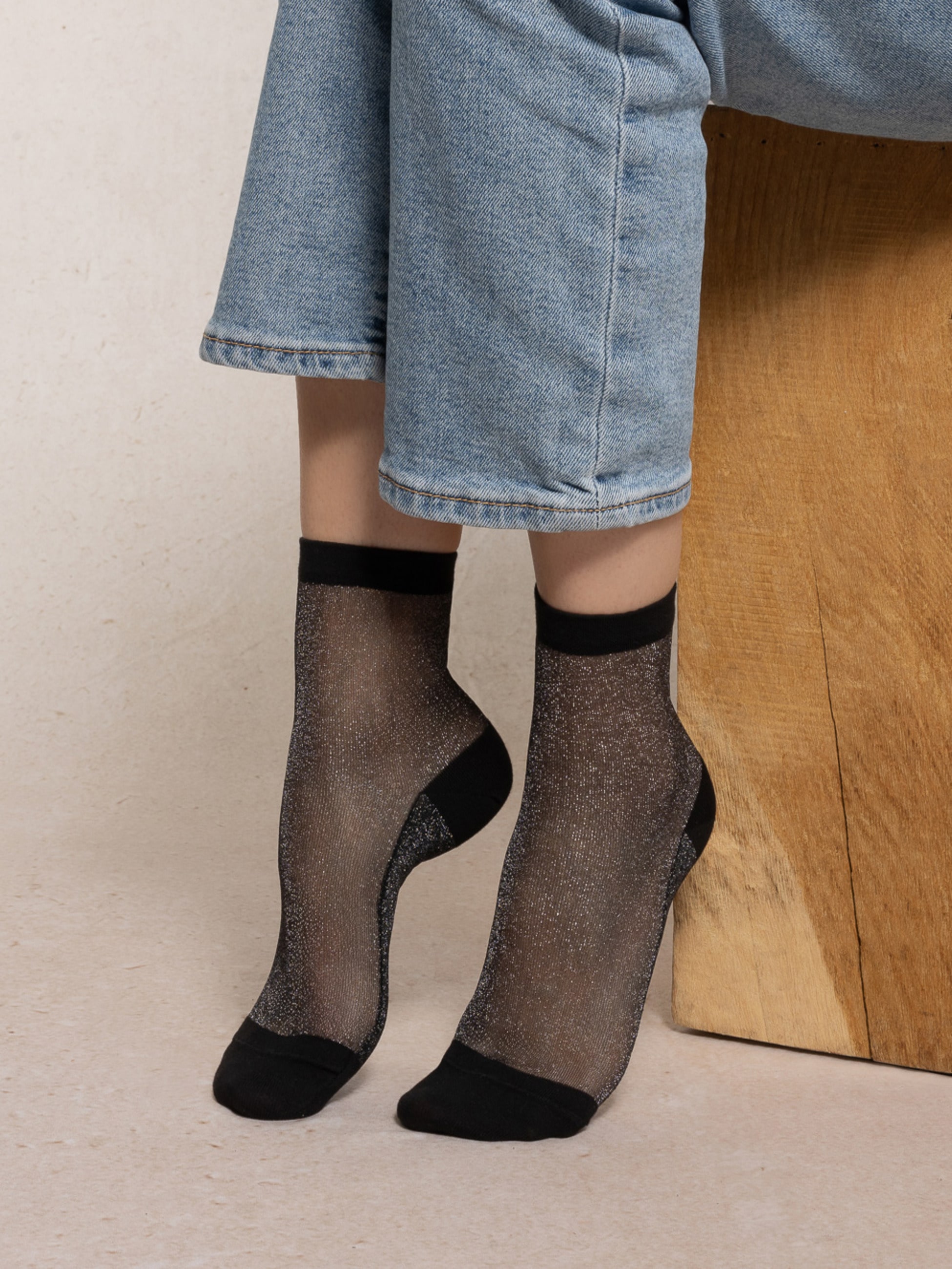 - シアーな質感と繊細なラメのきらめきが、エレガントな雰囲気を演出するアンクルソックスです。パンプスやバレエシューズからチラリと見せていただくのも素敵です。カジュアルから綺麗目まで幅広いスタイリングにフィットします。その他のBLEU FORETのアイテムもございます。