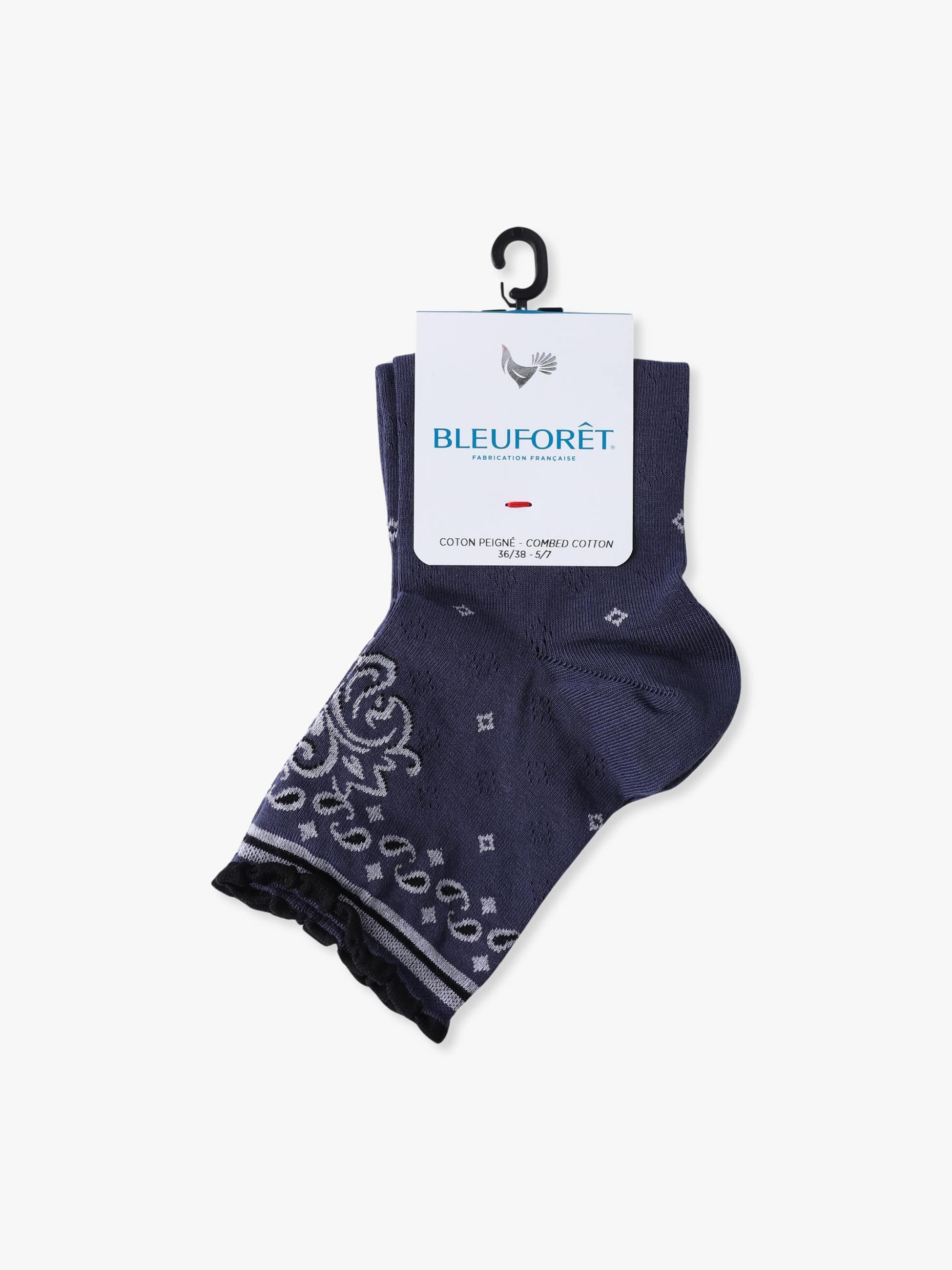 柔らかいコットンをたっぷりと使用したアンクル丈のソックスは、締め付けのない快適な履き心地で、シーズンレスに活躍します。遊び心のあるバンダナ柄がシンプルな装いにも映える1足です。その他のBLEU FORETのアイテムもございます。