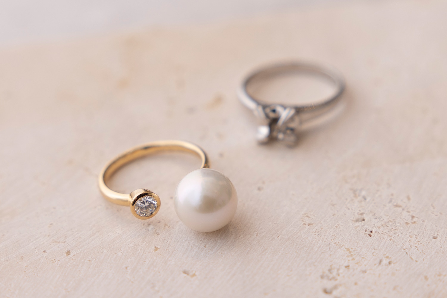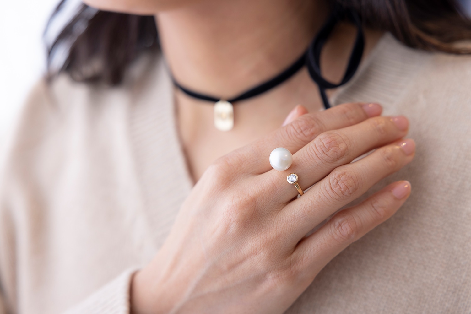 そんなMizukiさんをReborn Projectへ歩み寄らせたのは、自身のジュエリーへの情熱でした。「私にとってジュエリーづくりは、自分が愛する二つのものが完全に融合したものです。アートとファッション。もっとも情熱を感じ注ぐことができることなのです。ジュエリーを『生まれ変わらせる』ことは、お客様にとって、新しい始まりとなるものでなければなりません」。Mizukiさんと私たちの心が一つになってから、長い試行錯誤が始まりました。アームの太さ、ベゼルの角度、ベストなバランス……。試作を重ねて完成するまで、プロジェクトの始まりから5年の月日が経っていました。Reborn Projectのジュエリーを改めて見てみましょう。目を引くのはMizukiさんのシグネチャーであるフレッシュウォーターパールです。「この世に完璧なパールは存在しないと思います。女性も同じではないでしょうか。パールも一つ一つ、色や形が違います。ですが、女性もパールもどちらも美しい。パールは女性を象徴しているかのように思えます」。
