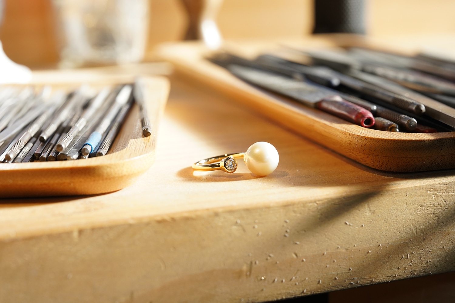 とはいえ、Mizukiさんは、今回の主役であるお客様のジュエリーを引き立てることを大切にしています。「デザインはユニバーサルです。本当に色々な石が持ち込まれるでしょう。大きいかもしれないし小さいかもしれないし、形もさまざま。お客様がお持ちになる石と私が大好きなパールと共存できるデザインに仕上げます。お互いにその存在に敬意を表することができるような、決してお互いをじゃますることがないデザインを考えました」。お客様の貴石と寄り添うMIZUKIのジュエリーがかもし出す美しさ。世界に一つだけの特別なリングの誕生です。
