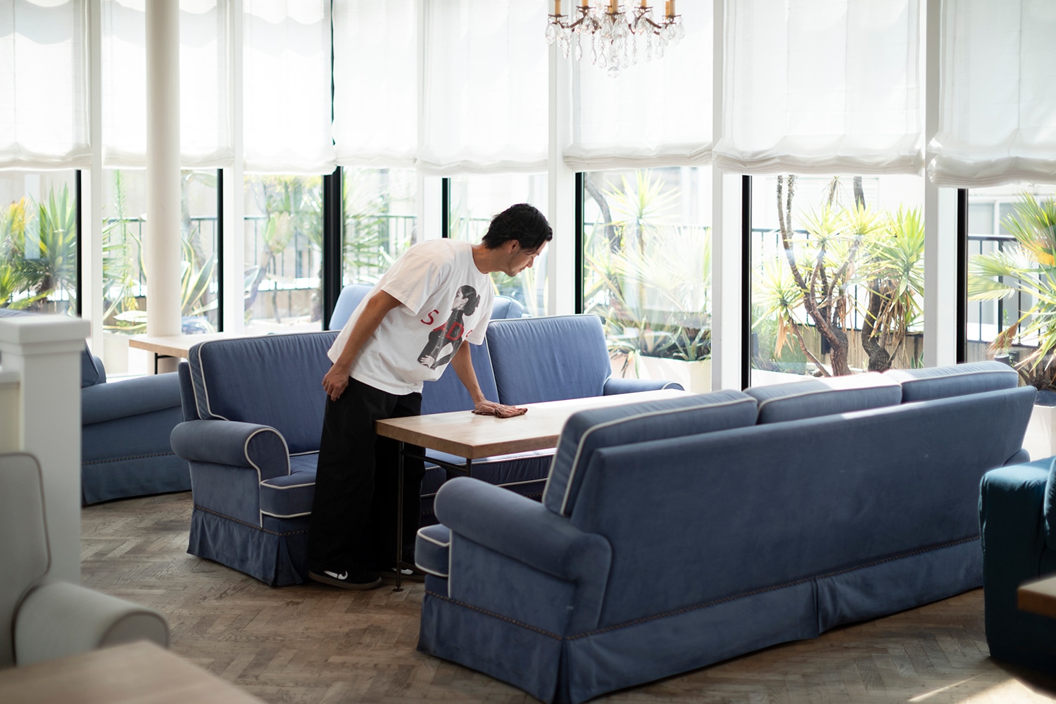 「うわあ、すごい!」。京都店を初めて訪れた多くのお客様が、驚きの声を上げます。ビルの最上階、エレベータのドアが開くと、太陽の光がさんさんとそそぐ庭と涼やかな噴水が、お出迎えをいたします。ストアの天井は高々として、開放的な空間が広がっています。京都店の自慢の一つは、全国のロンハーマンのストアの中でもっとも広い売り場面積。ゆったりとした店内は、ショッピングを楽しむお客様の笑い声やスタッフとの会話であふれています。今では多くのお客様に愛していただいている京都店ですが、誕生したばかりのころは、スタッフみんなで悩んだことも……。