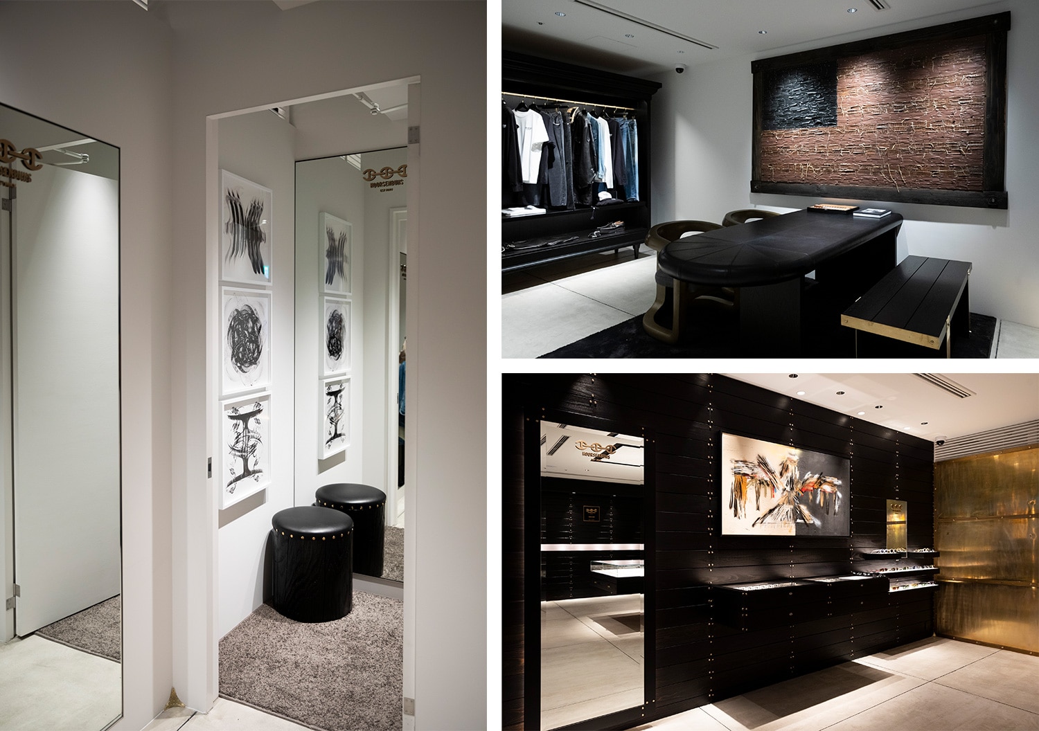 ストアを飾るアートピースは、ロバートさんお気に入りのアーティストが手がけたもの。ちなみにドレッサーにある黒いスツールは、ニューヨークの山中で見つけた丸太を自ら加工してつくった思い入れのある一脚