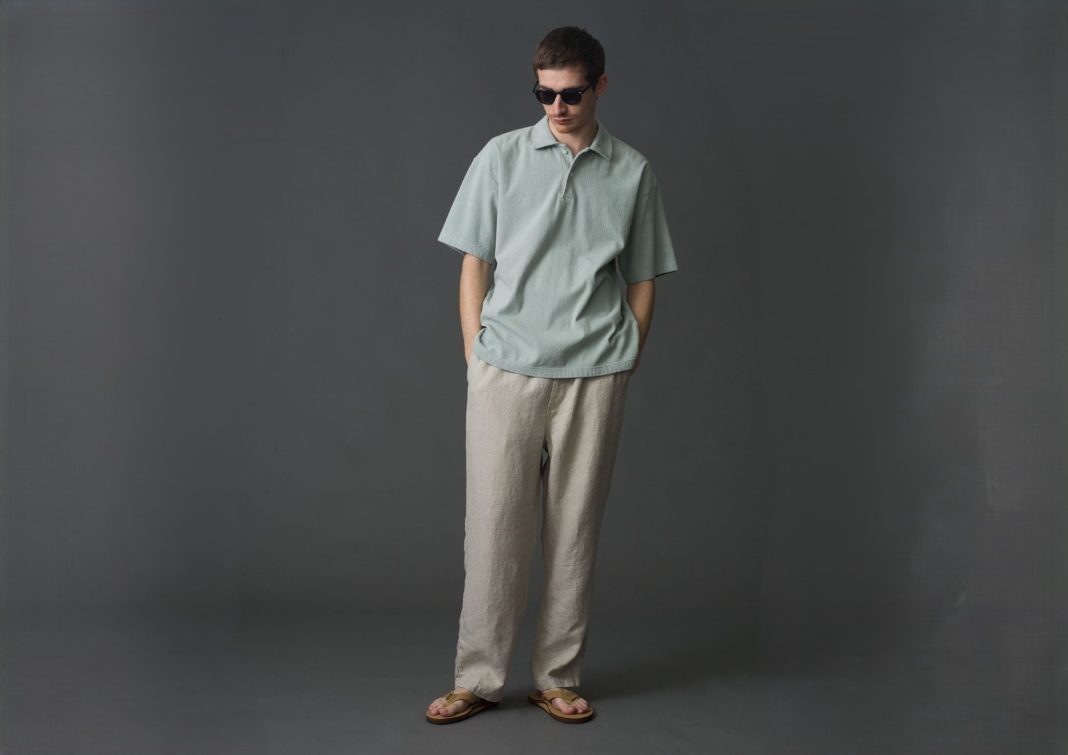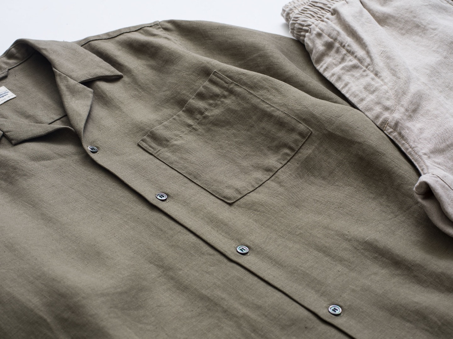 40番手のリネンを高密度に仕上げた綾織素材を採用したジャパンリネンシャツ&パンツ。染色後に生地を優しく叩きほぐし、ソフトでふっくらとした洗いざらし風のワッシャー仕上げを施して、リネン特有のナチュラルなツヤのある生地の美しさを最大限に引き出しています。開襟シャツは着回しの効くベーシックなデザインながら、第一ボタンの位置、小さめの襟、袖山の高さ、やや絞った袖口など、ナチュラルな生地をクリーンに着こなすため設計されています。程よくゆったりしたフィット感で、身体に自然に添うよう計算されたパターンによって、すっきりとしたシルエットに仕上がりました。イージーパンツはリネンの涼しさや肌触りの良さを実感していただける爽やかな履き心地で、程よいゆとりの腰回りからテーパードさせたラインが美しく、サンダルやコンパクトなシルエットのレザーシューズなど、夏の足元に相性の良いデザインです。