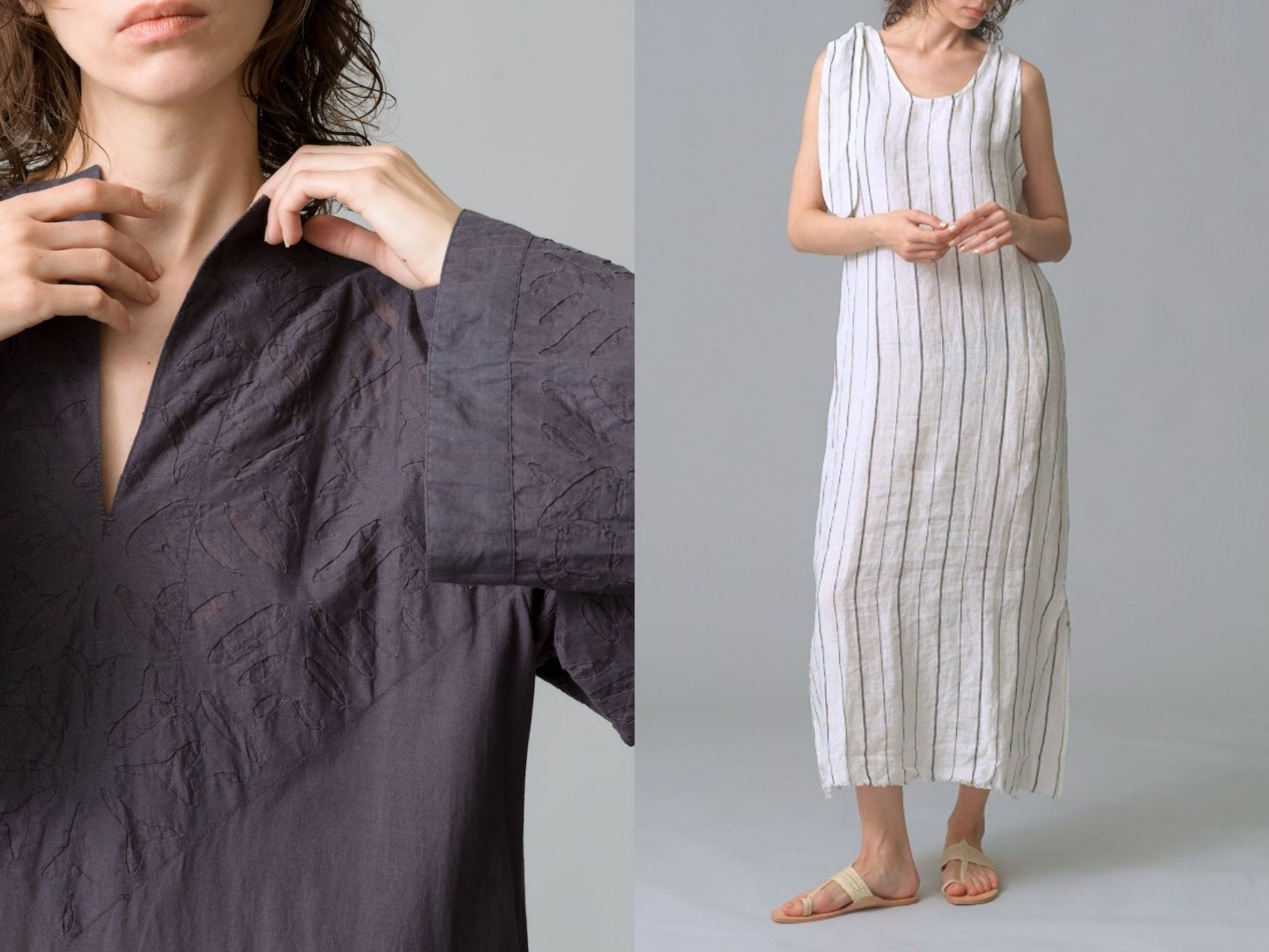 ほかにも、インドのアップリケ文化を象徴する「リバースアップリケ」の手法を取り入れたカフタンドレスやスカート、熟練の職人が手紡ぎ、手織りする「カディリネン」を使ったノースリーブワンピースなど、素材の美しさが引き立つアイテムを豊富にラインナップいたします。
