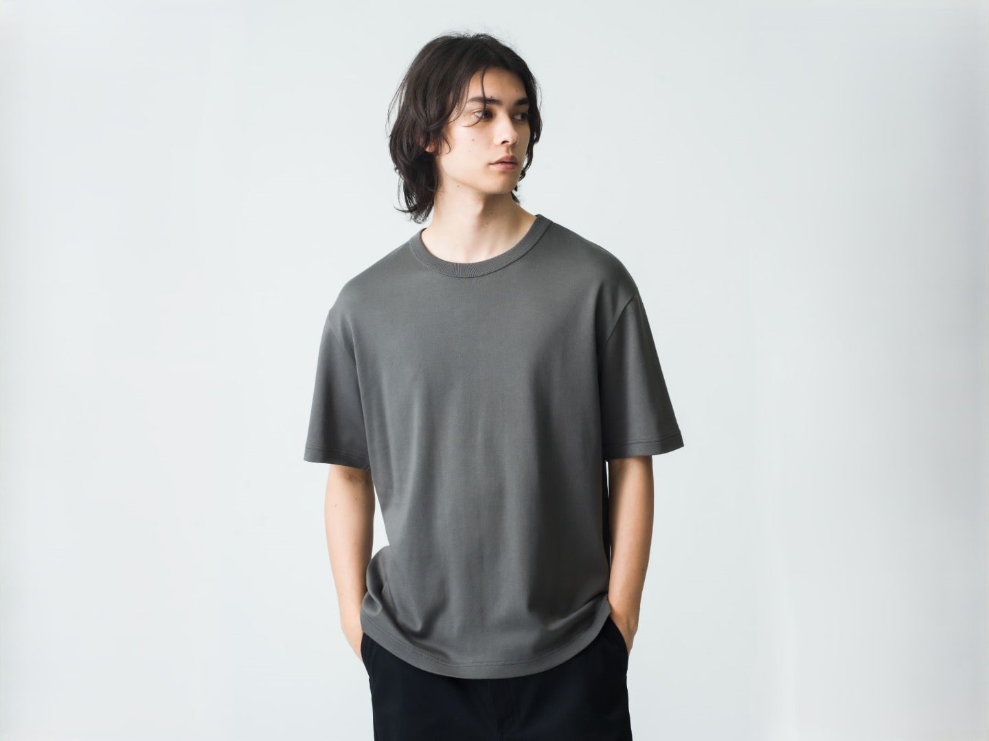 Crew NeckとNo Sleeveタイプは適度なゆとりがあるフィット感、Mock Neckはオーバーサイズのフィット感でoff white、charcoal gray、clayの3色展開となります。