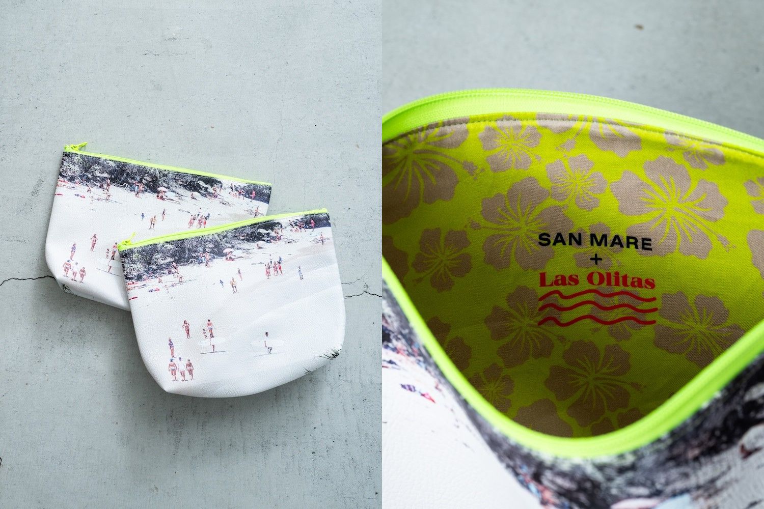 さらに、ハワイ在住経験のある天満氏が愛用するHonolulu発のブランド「Las Olitas」とのスペシャルコラボレーションも実現。「SAN MARE × Las Olitas」のポーチは、ビーチに人々が集まり、思い思いに楽しむ様子を転写プリントで表現。内側にはハイビスカス柄をあしらい、逗子のロケーションにもぴったりな仕上がりです。
