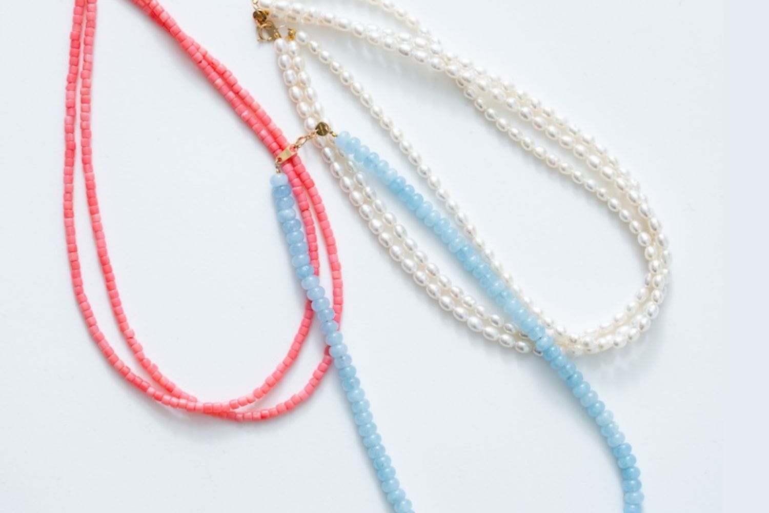 Coral Necklace ¥96,800 / Blue Quartzite Necklace ¥88,000 / Freshwater Pearl Necklace ¥132,000