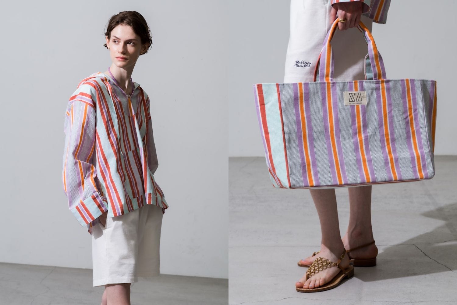 逗子マリーナ店限定で展開される今回のコレクションは、"Seaside Stripe(シーサイド ストライプ)"と名付けられた、カラフルでランダムなストライプ柄が印象的。少し色あせたようなパープルやオレンジが絶妙なアクセントになり、どこかヴィンテージライクで心地よい雰囲気をまといます。ブロックプリントならではの手作業によるゆらぎのある線や、やわらかな風合いも魅力のひとつ。海やプールの後にさっと羽織れるフーディや、ブランドのアイコン的存在でもあるキャンバスパンツのほか、ドレスやトートバッグなど夏のリゾートシーンを彩るアイテムが揃います。