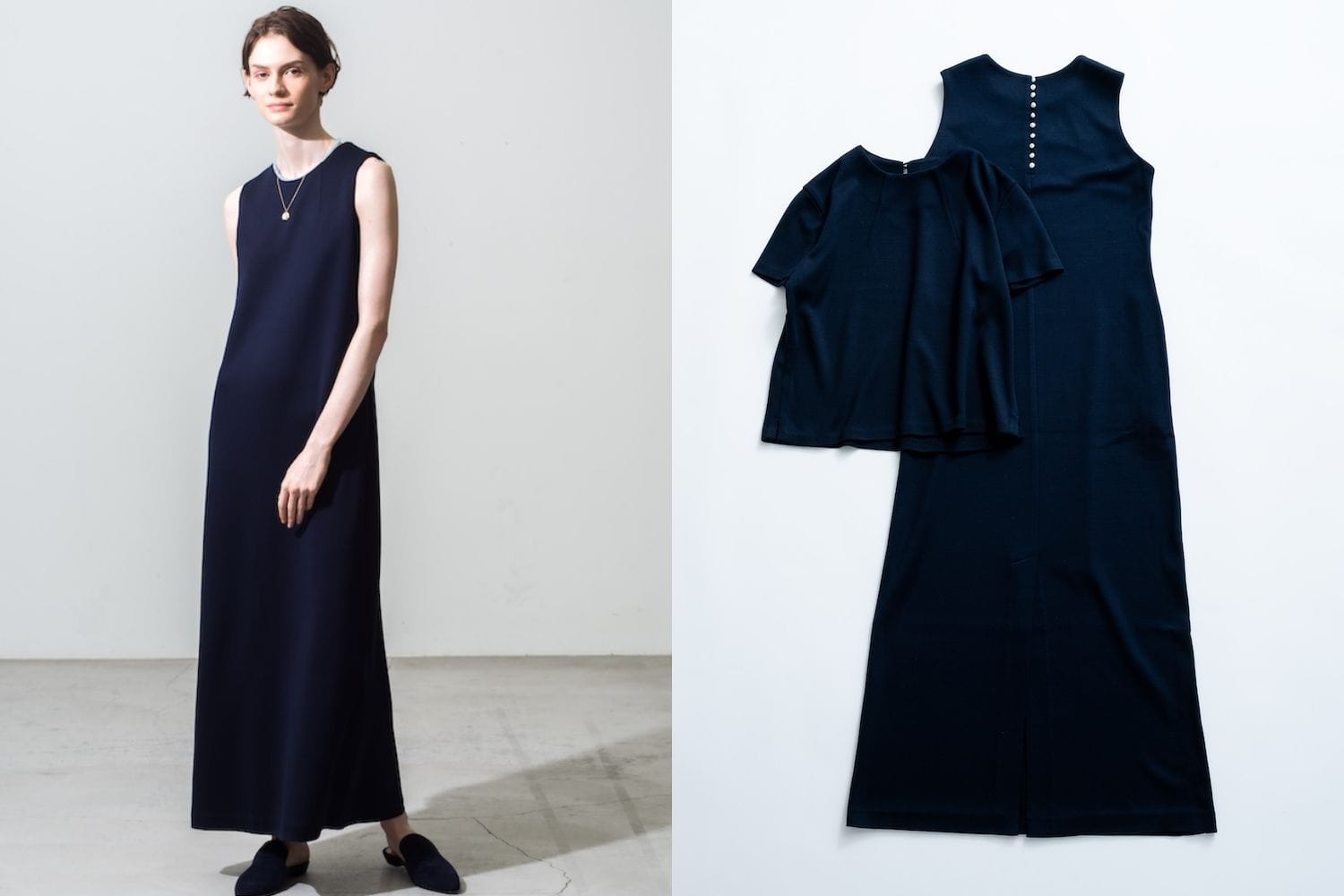 Tシャツは、さらりとデニムやサンダルに合わせても品よく決まるよう、袖まわりに布帛のシャツのような立体的なパターンを取り入れました。カジュアルさの中にも、さりげないきちんと感が漂います。ドレスは、ゆったりと風をはらむようなシルエットに。肩の力を抜いた着こなしでも、美しく見えるバランスにこだわって仕立てました。また、Tシャツには大粒の淡水パールを一粒、ドレスには10周年を記念し小粒の淡水パールを10粒、ボタンとしてあしらっています。海を思わせるやさしい輝きが、特別な一着にそっと華を添えます。