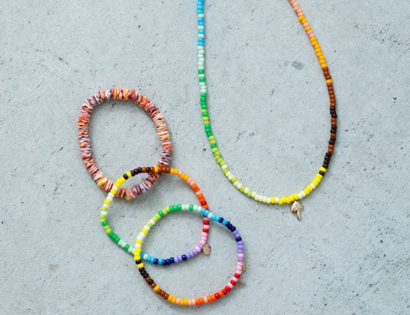 そして、今回キッズだけのジュエリーも展開。子どもたちのなじみのあるカラフルなビーズをベースに、10Kのゴールドトップをあしらったファーストジュエリーです。お子さまが成長しても身に着けられ、トップが取り外せるため大人になっても付け替えて着用できるのも特別感を与えてくれます。さらに、お揃いのカラービーズとコーラルシェルのブレスレットもご用意し、小さなころから自然と本物に触れる体験を大切に。という想いが込められています。