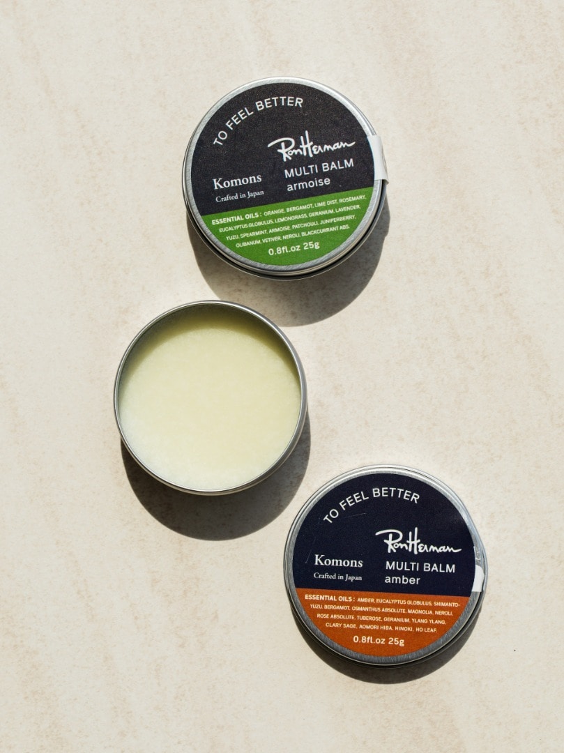 amber / armoise100%ナチュラルなマルチバームは、ハンドケア、リップケア、ヘアワックスなど全身で使用可能です。鹿児島で無農薬栽培されたカミメボウキエキス(ホーリーバジルエキス)をはじめ、チョウジエキス、コメヌカエキス、カワラヨモギ花エキスなどの4つの植物成分が潤いを与え、ハリのある肌に導きます。カミメボウキは、インドのアーユルヴェーダではトゥルシーと呼ばれ、神聖で最高位のハーブとして永く親しまれています。缶入りなので持ち運びもしやすく、外出時にいつでもサッとケアができる心強いアイテムです。