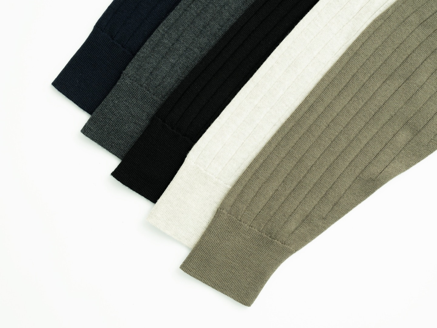 美しくきめ細かな編目が特徴でポール・ウェラーをはじめとする英国ミュージシャンたちにも愛されてきたアイテムを、今回の別注ではクラシックでオーセンティックなヘンリーネックの仕様を踏襲しつつ、30ゲージニットを24ゲージに変更しリブの幅を広めに調整した、ロンハーマンだけの特別仕様に仕上げました。
