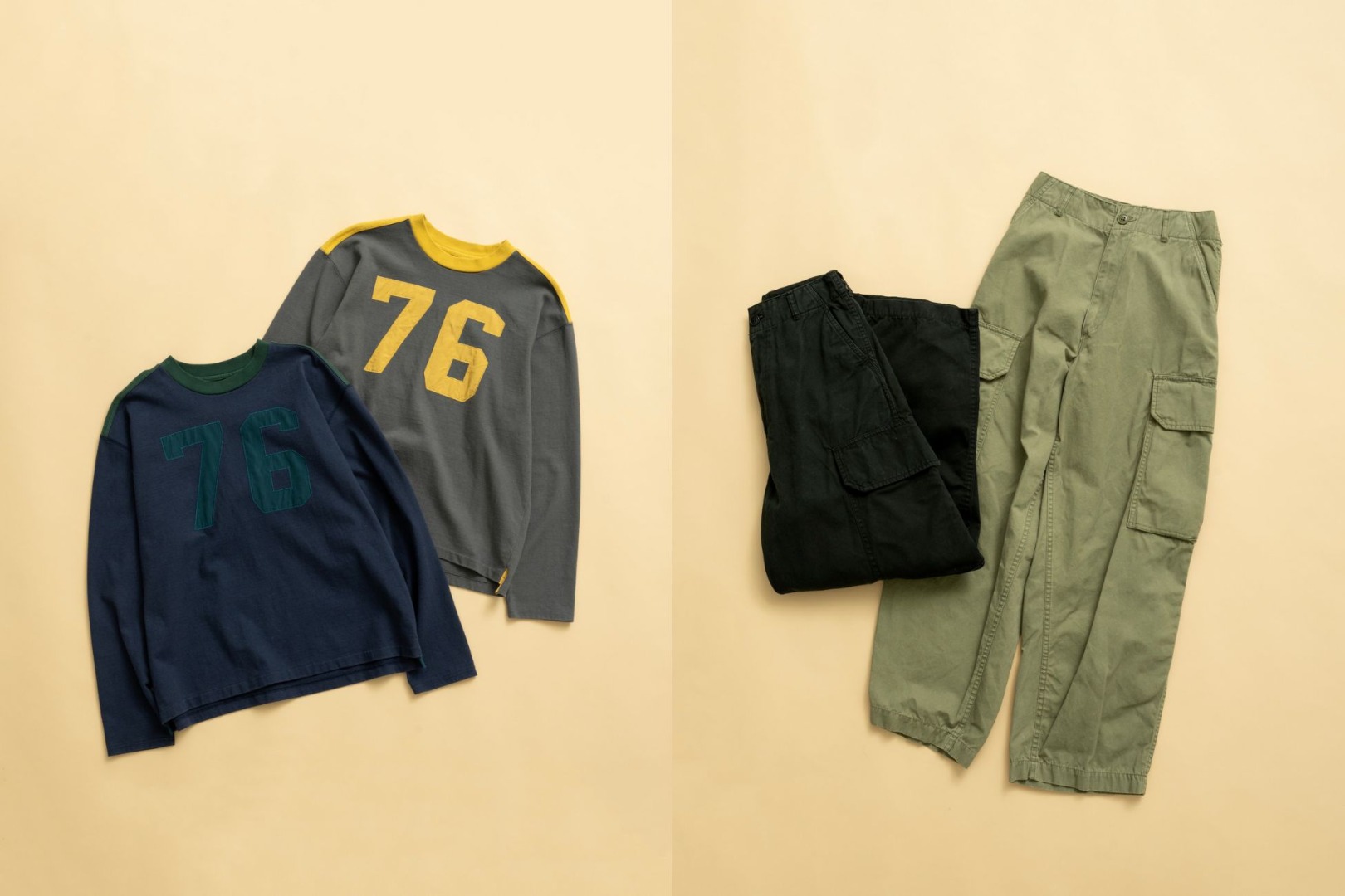 ラインナップには、プリントTシャツやフーディ、ミリタリーパンツなどが登場。風合いやディテールにこだわり、ヴィンテージらしい雰囲気をまとわせています。