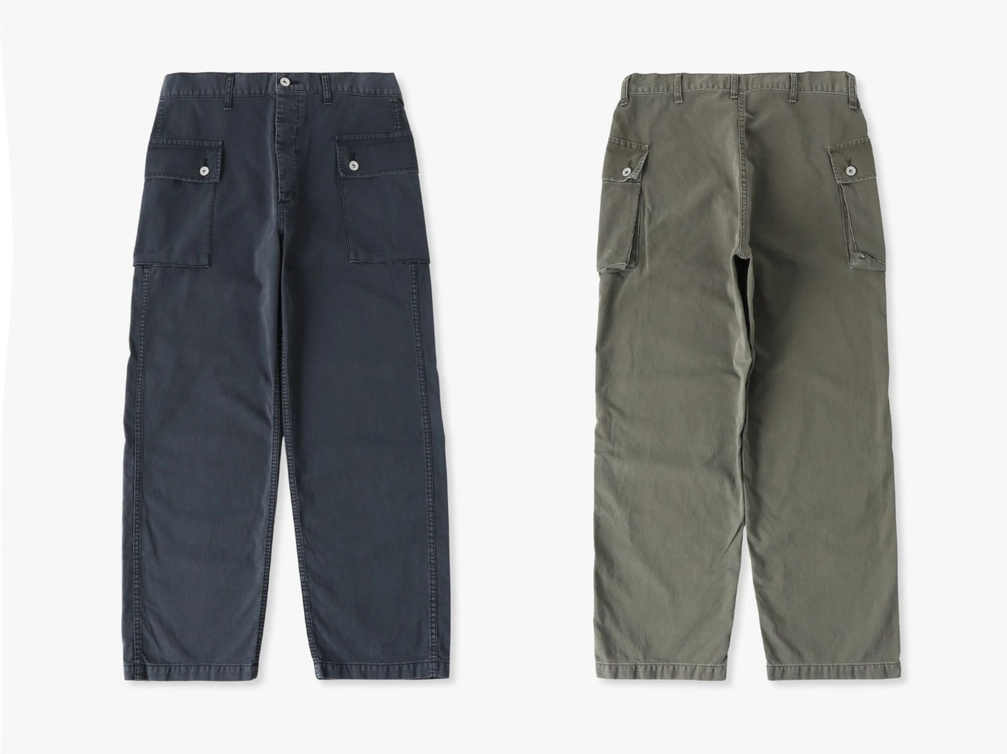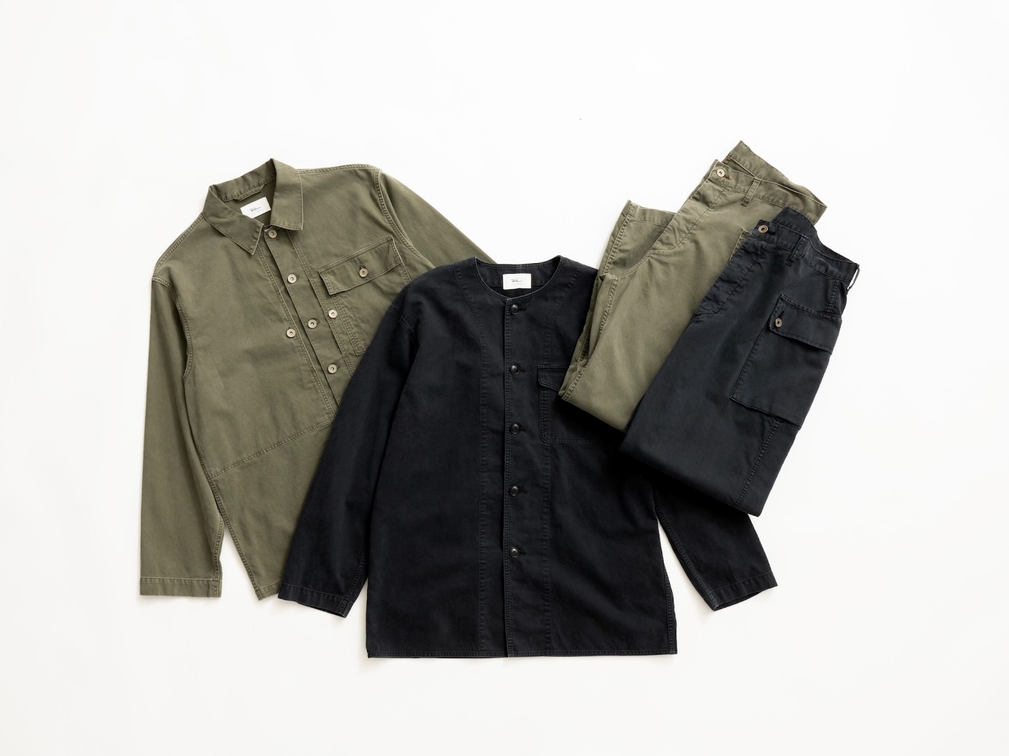 ミリタリーコードレーン生地を使用した好評のシリーズに新アイテムが登場いたします。カラーはブラックとオリーブの2色展開。ユーティリティージャケットは、1940年代にUSMCに支給されていたカバーオールタイプのP-41の後継モデルであるP-44をベースに、ゆったりとしたフィットで様々なコーディネートに合わせやすく、汎用性の高い一着に仕上げました。シューティングジャケットは、射撃用シューティングジャケットをベースにしたデザインで、襟のないすっきりしたデザインが特徴のジャケット。Tシャツやフード付きのインナーなど、スタイリングで印象ががらりと変わる飽きの来ないアイテムです。パンツはUSMCに支給されていたモンキーパンツをベースにした丈夫で動きやすいデザインで、現代的にソリッドなディテールワークへアップデートしたデザインと生地本来のストライプ状の畝や、さらっとした肌触りが特徴です。製品染めやロングストーンウォッシュ加工を施したヴィンテージのようなフェード感のあるカラーリングとアタリをお楽しみいただけるシリーズとなっております。