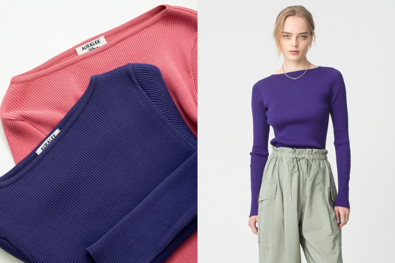 定番のギザボートネックのプルオーバーには、秋の気分を高める鮮やかなパープルと、深みのあるモーブピンクの2色が新登場。しなやかでとろみのある風合いと上品な光沢が魅力の一着は、季節を問わず長くご愛用いただけるAURALEEならではの逸品です。