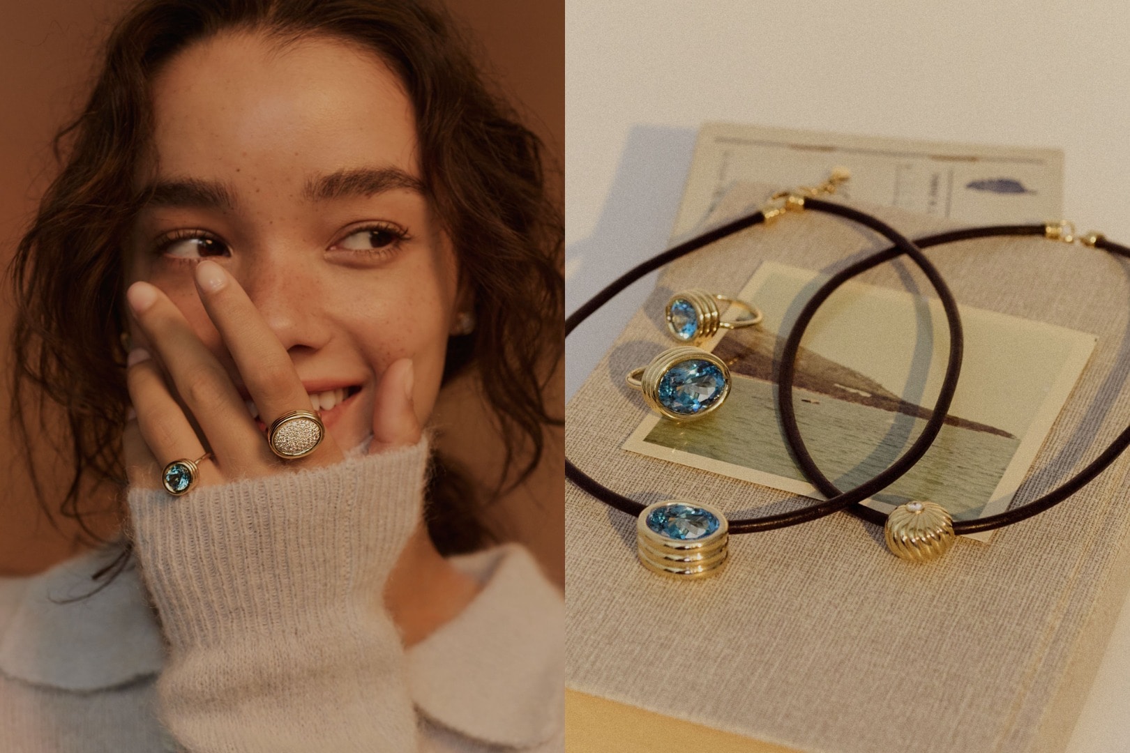 なかでも印象的なのは、デザイナー自身が愛するスキューバダイビングから着想を得た、ダイビングマスクモチーフのジュエリー。18Kゴールドに存在感のあるダイヤモンドやブルートパーズの貴石をあしらい、滑らかな曲線と流れるようなラインで、水中の静寂と生命力を表現しています。貴石に肌が透過されるよう設計されたデザインも印象的です。