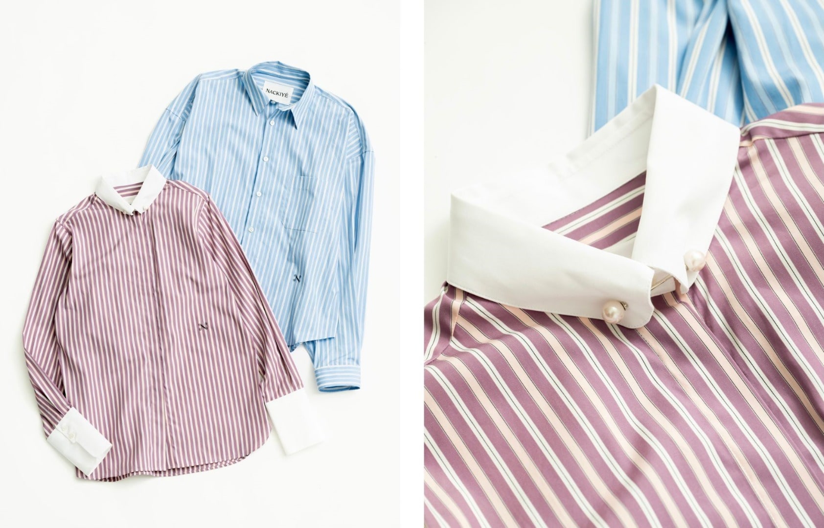 首元にあしらわれたダブルパールのネックピンと、袖口のカフスディテールがエレガントな印象を添えるドレッシーなシャツ「Saville Shirt」。一枚で着映えする主役級のデザインが魅力です。パールのディテールは、過去にワンピースにも取り入れられてきた、Nackiyeのアイコニックなモチーフのひとつ。さらに、前身頃のウエスト部分には、ブランドを象徴する繊細な刺繍も施されており、細部にまでこだわりが感じられる一着です。