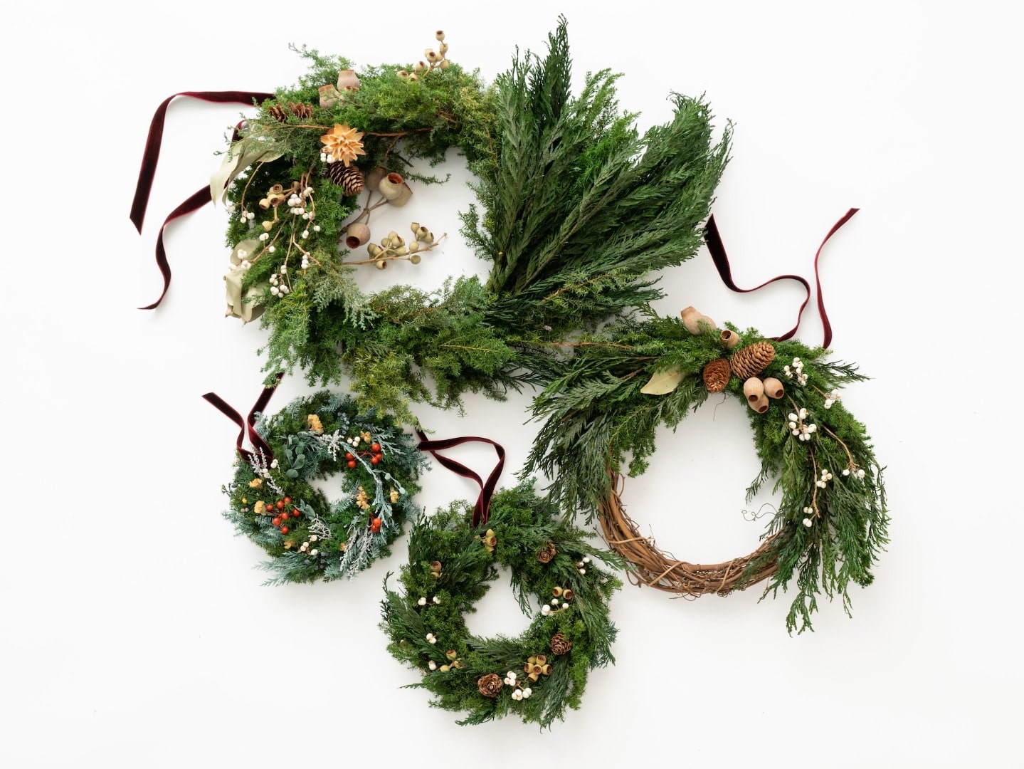 クリスマスを特別に彩る大小さまざまなリースの中から、お気に入りの一つを楽しく選んでいただけますように。