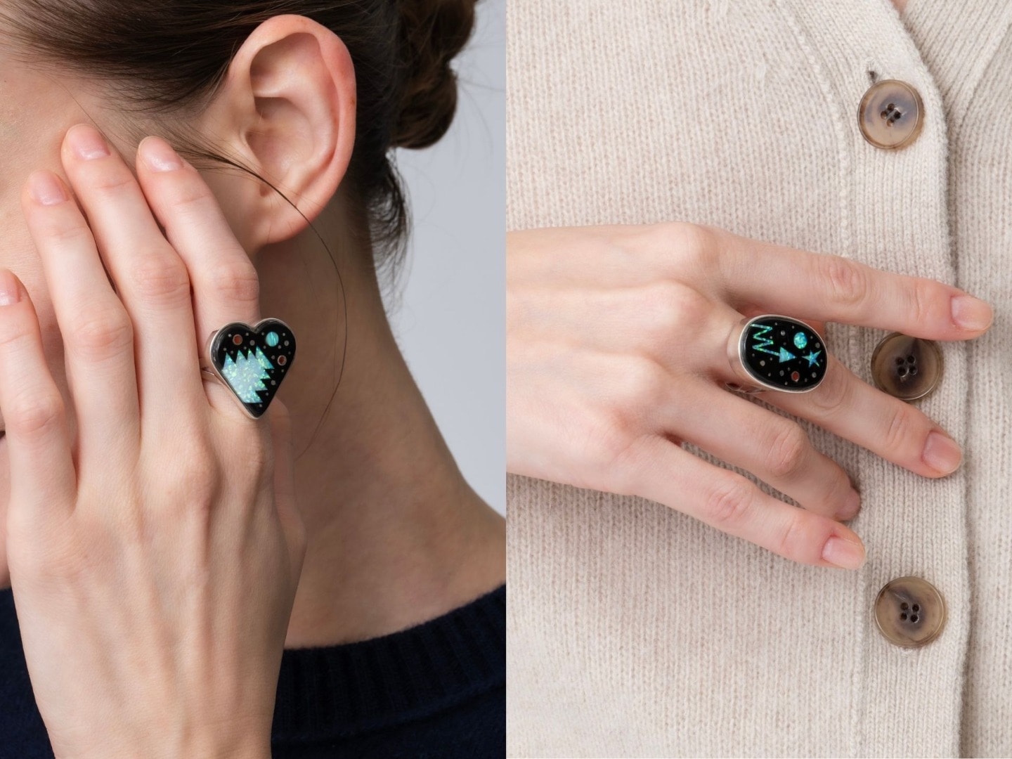 星やハート、丸モチーフなど、多彩なデザインが印象的なリングは、ひと目で心を惹きつける存在感。指にのせるだけで気分がふわっと華やぎ、どこか幸せな気持ちにさせてくれます。