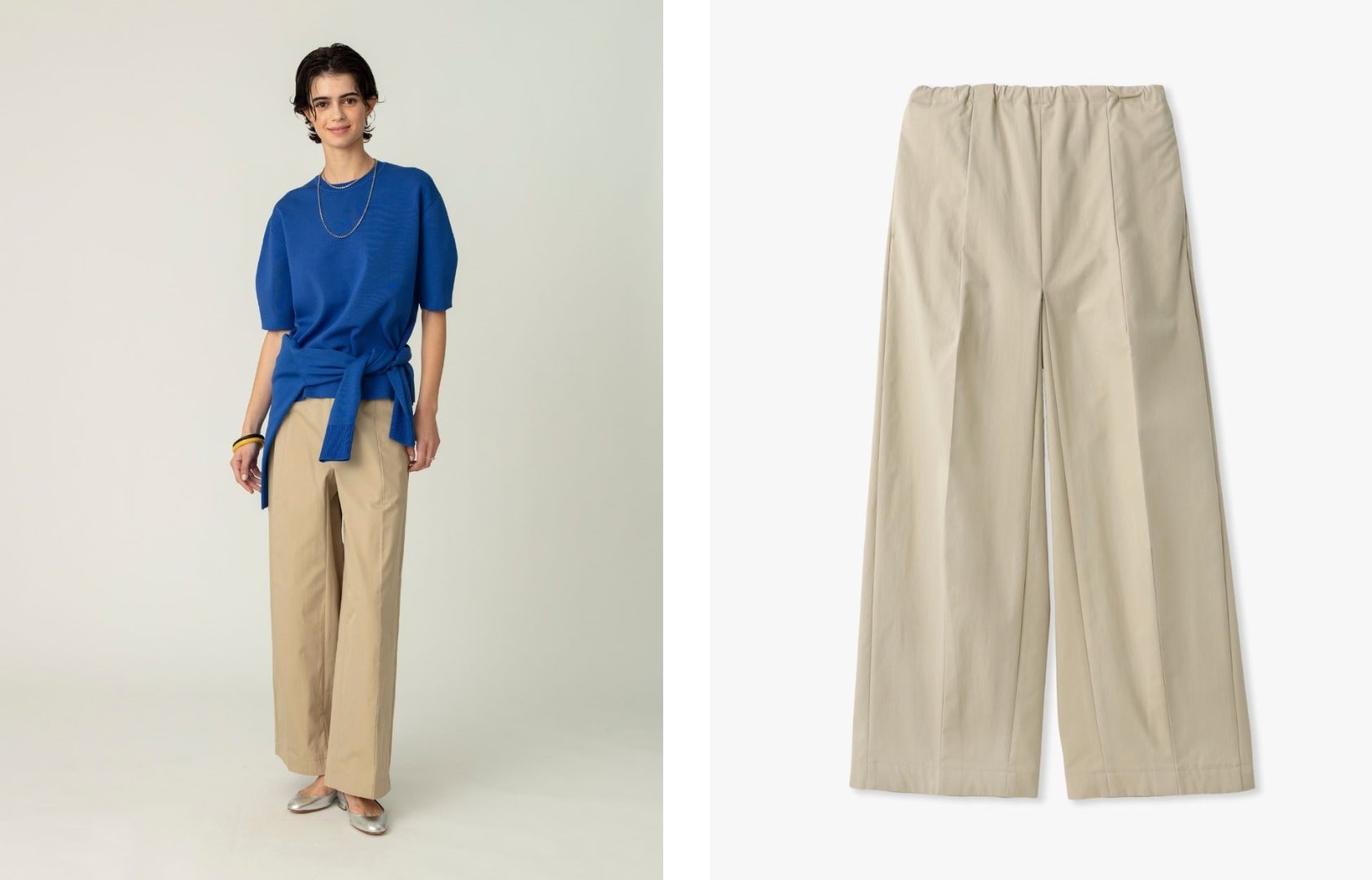 また、コートと同素材を使用した、ややクロップド丈のワイドパンツをベージュとネイビーの2色で別注。ウエストにタックを施すことで立体感のあるフォルムに仕上げ、腰位置を少し落としてルーズに着用いただくのがおすすめの一本です。
