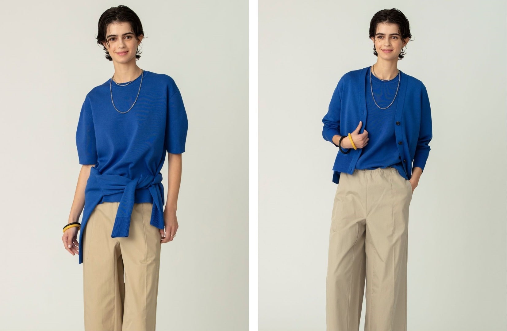 カーディガンは、数年前に人気だったデザインをすっきりとしたシルエットにアップデート。ボタンを留めればVネックトップスのようにも着られる、万能な一枚です。プルオーバーニットは総針で丁寧に編み立てることで、素材の落ち感とふくらみを引き出しています。また、ショートスリーブニットは、袖口にかけて繊細な編みの工夫を施すことで、自然な立体感が生まれ、腕まわりを美しく見せるバランスに仕上げています。