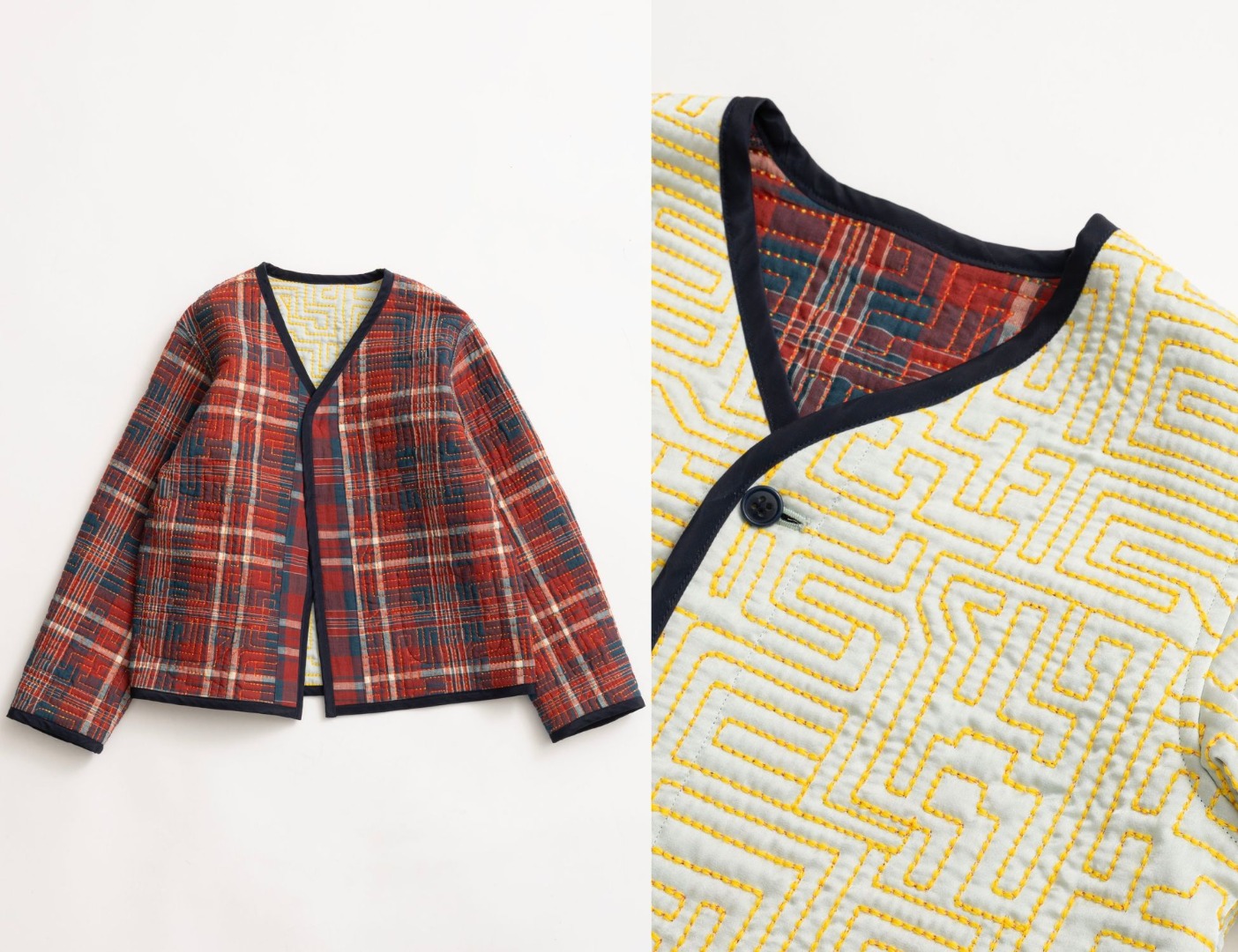 今回登場する別注ジャケットは、ブランドの過去の人気アイテムから特別にキッズ Exclusiveアイテムとして復刻していただいたスペシャルアイテム。アフリカのプリミティブな模様から着想を得た柄を構築した目を惹く刺繍ジャケットです。太めの糸で大胆にデザインを施し、中に中綿を入れることで立体的なフォルムに仕上げたキルトジャケットを今回新たにロンハーマンキッズだけのカラーリングでリバイバルしました。リバーシブルにも着用可能で、裏面の生地はインド綿のチェック柄を使用し、パイピングは裏のチェックからリンクさせた配色のデザインに仕上げました。