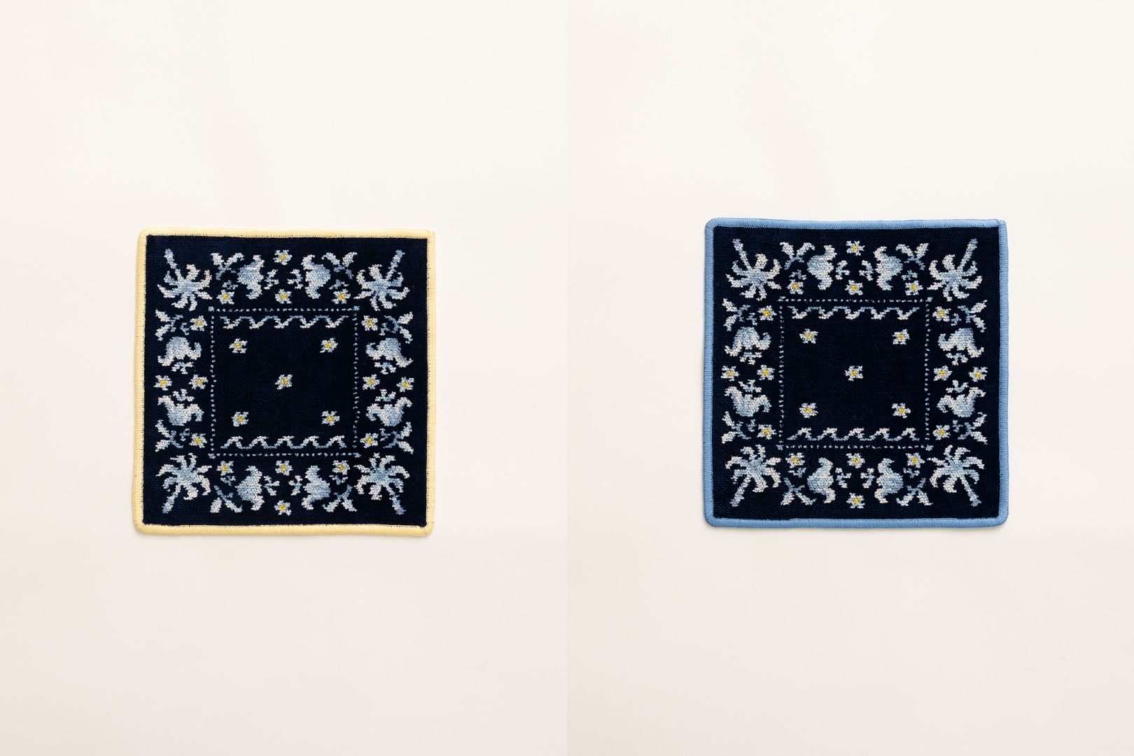柔らかで厚みのある質感と多彩な色から織りなす奥行きのある美しい発色が魅力のシュニール織は、一方で細かな柄を表現するには丁寧な図案づくりと熟練された職人による調整が欠かせません。本企画ではバンダナ特有の繊細な柄を再現するため、幾度にもわたる試作を重ねました。そうして完成したのが、FEILERの伝統的なものづくりとロンハーマンらしさが融合した唯一無二のハンカチです。