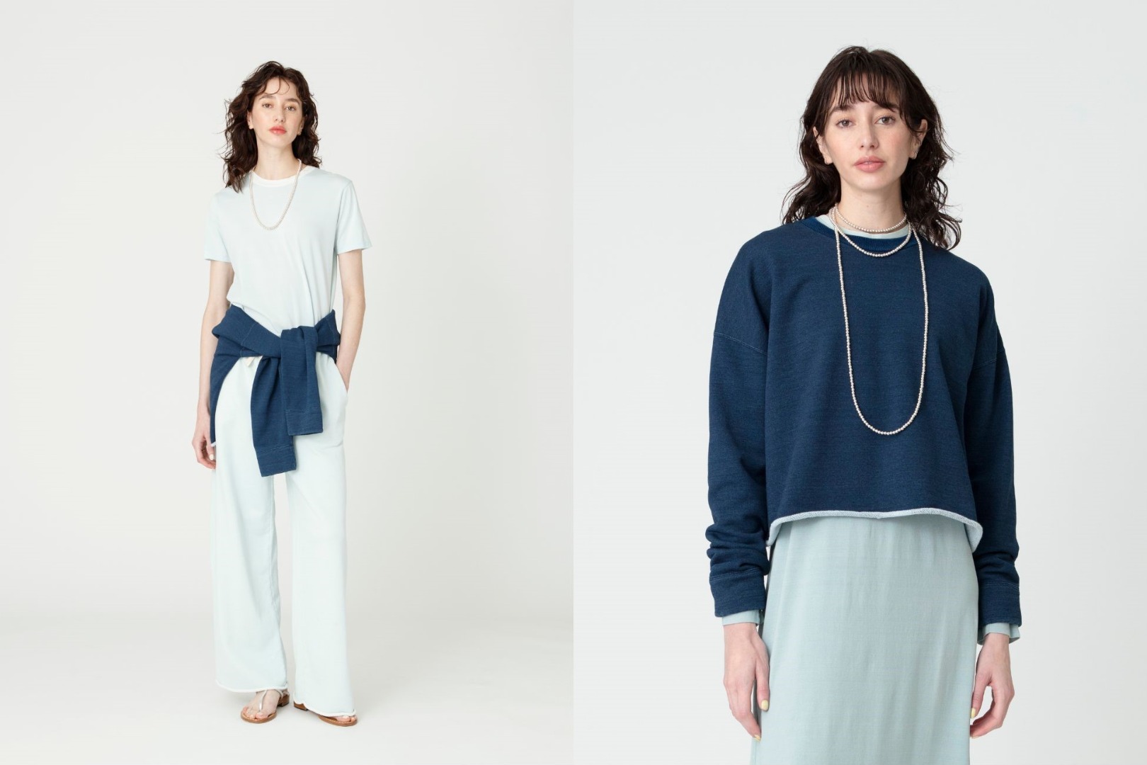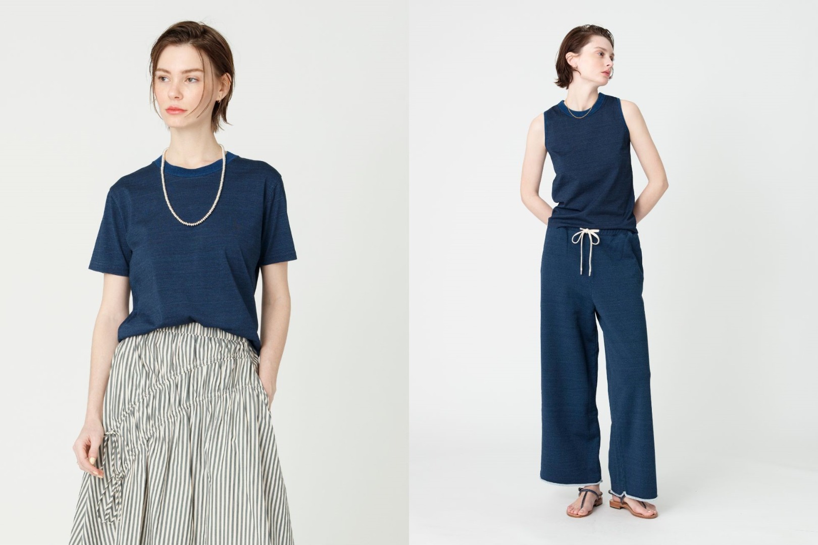 そんな特別な糸を表糸に使用した裏毛と天竺素材のシリーズ。1枚で着るのはもちろん、異なるアイテムを重ねることでインディゴの濃淡を楽しむスタイリングもお楽しみいただけます。