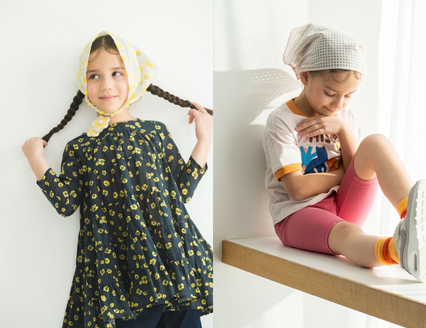 透かし柄のチェック柄と立体的なミモザが特徴的なジャガード生地の質感を活かした三角スカーフ(ずきん)をロンハーマンキッズだけのために特別にオーダーしたアイテム。涼しげで優しい日除けとしても◎ゴムベルトがついているので優しくフィットします。あごに引っ掛けてほっかむりに。襟足にゴムを引っ掛けてスカーフをまいているようにワンタッチで装着ができます。春らしくピンクとイエローカラーに可憐な織りデザインがこの春の子どもたちのスタイリングに華を添えてくれます。