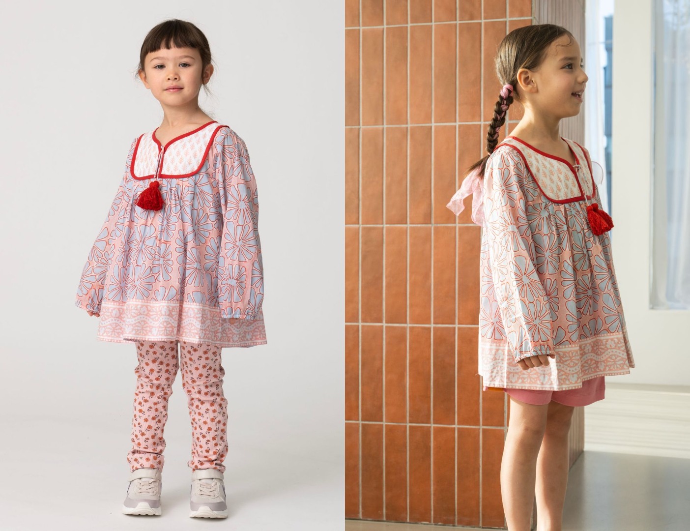 インドの伝統的なブロックプリント(手捺染)に魅了されたサラが、インド・ジャイプールの職人たちと共に、ウェアや日用品を展開しているSZ Blockprints。自身も母であるデザイナーSarah とのコラボレーションアイテムは、女の子が思わず瞳を輝かせるような美しい色彩と心躍るようなトロピカルプリントの楽しい柄をふんだんに使用したチュニック。お尻が隠れるぐらいの着やすい着丈のヴィンテージドレス型をベースに、SZ Blockprints ならではの生き生きとはじけそうなエネルギーもぎゅっと詰め込んだ、遊び心たっぷりの可愛らしいチュニックワンピースです。さらに、成長に合わせて、小さいうちはワンピースとして、大きくなるにつれてチュニックとして楽しめ長い間愛用していただけます。キラキラ笑顔が弾ける元気な女の子にぴったり。